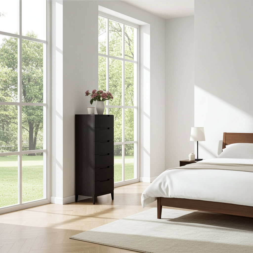 Despite its narrow footprint, the chest offers excellent storage capacity with five soft‑close drawers. These drawers glide smoothly and quietly, making daily use effortless. The vertical layout maximises storage without occupying valuable floor space, making it ideal for compact bedrooms, apartments or guest rooms.