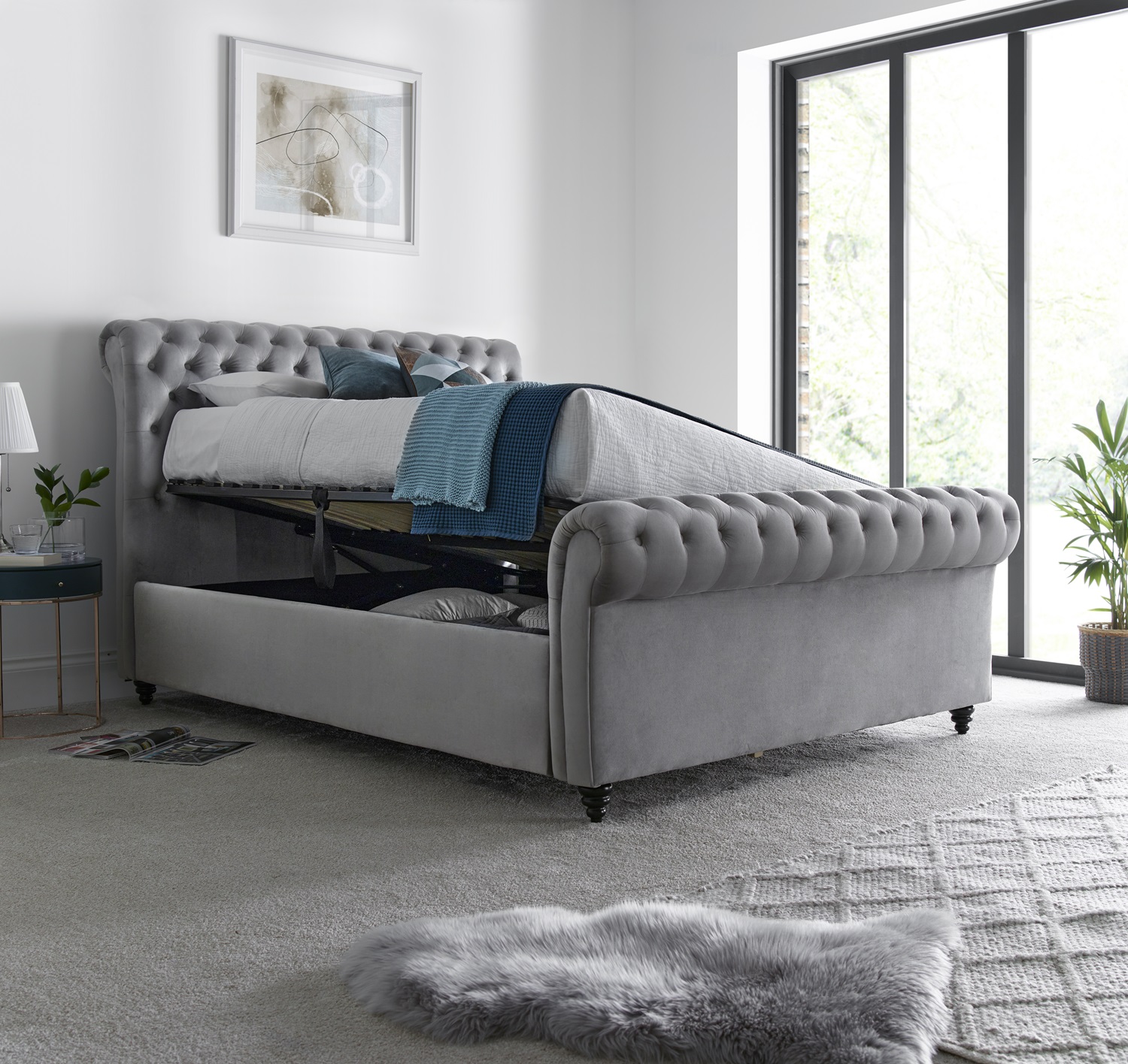The Osborne is a truly opulent bedframe finished with a beautiful velvet fabric. The solid frame features a stunning rolled and diamond quilted headboard with matching foot end and buttoned details. The sleigh bed is complimented with a side opening ottoman storage for the perfect balance of style and substance. The gas lift arms can be fitted to open from either side of the bed, giving you extra flexibility to fit into any room setting. The frame itself is constructed from high quality materials and uses sprung slats for mattress support. This construction, along with the wooden feet ensures the bed not only looks good but offers great strength and stability.