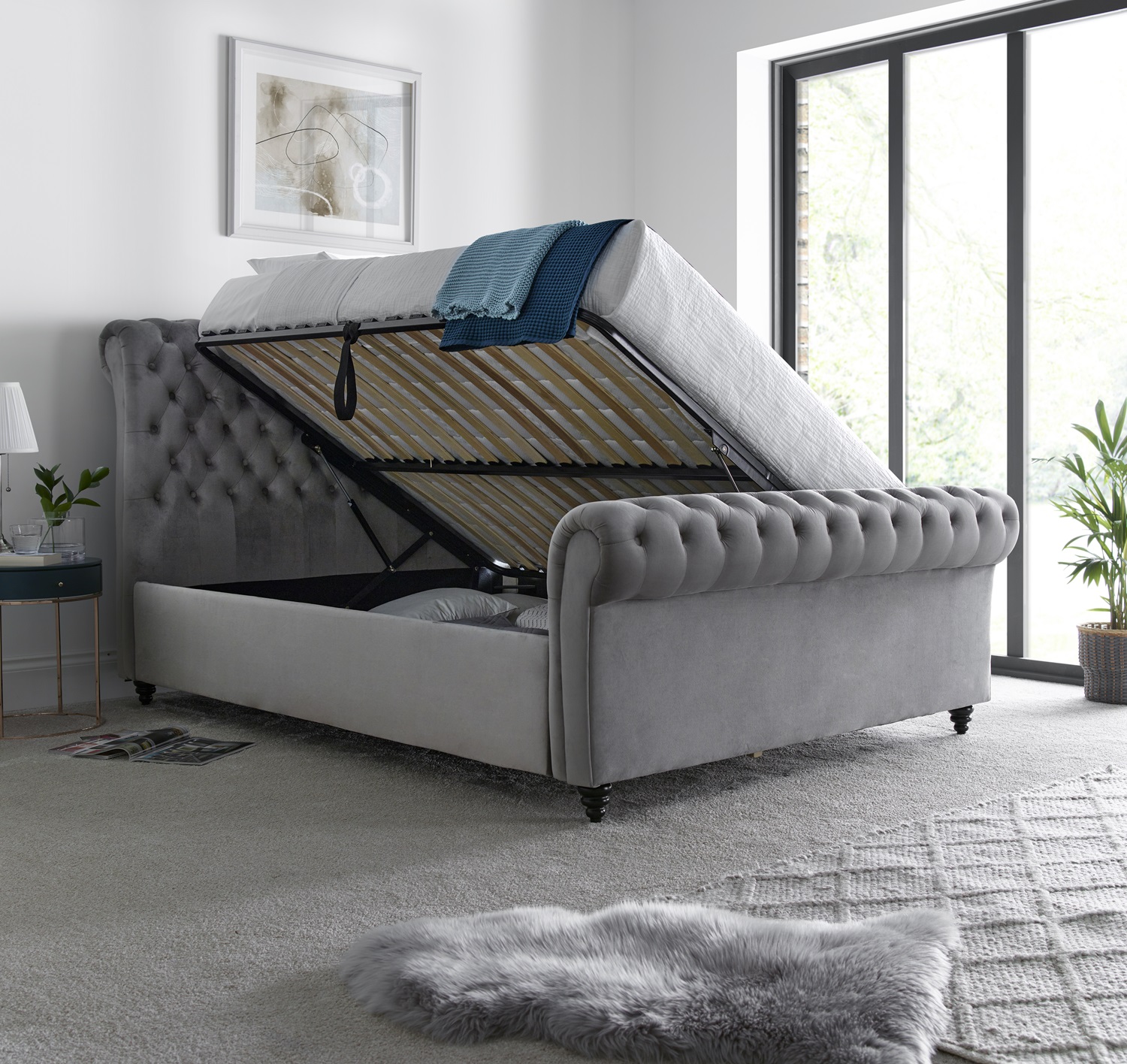 The Osborne is a truly opulent bedframe finished with a beautiful velvet fabric. The solid frame features a stunning rolled and diamond quilted headboard with matching foot end and buttoned details. The sleigh bed is complimented with a side opening ottoman storage for the perfect balance of style and substance. The gas lift arms can be fitted to open from either side of the bed, giving you extra flexibility to fit into any room setting. The frame itself is constructed from high quality materials and uses sprung slats for mattress support. This construction, along with the wooden feet ensures the bed not only looks good but offers great strength and stability.