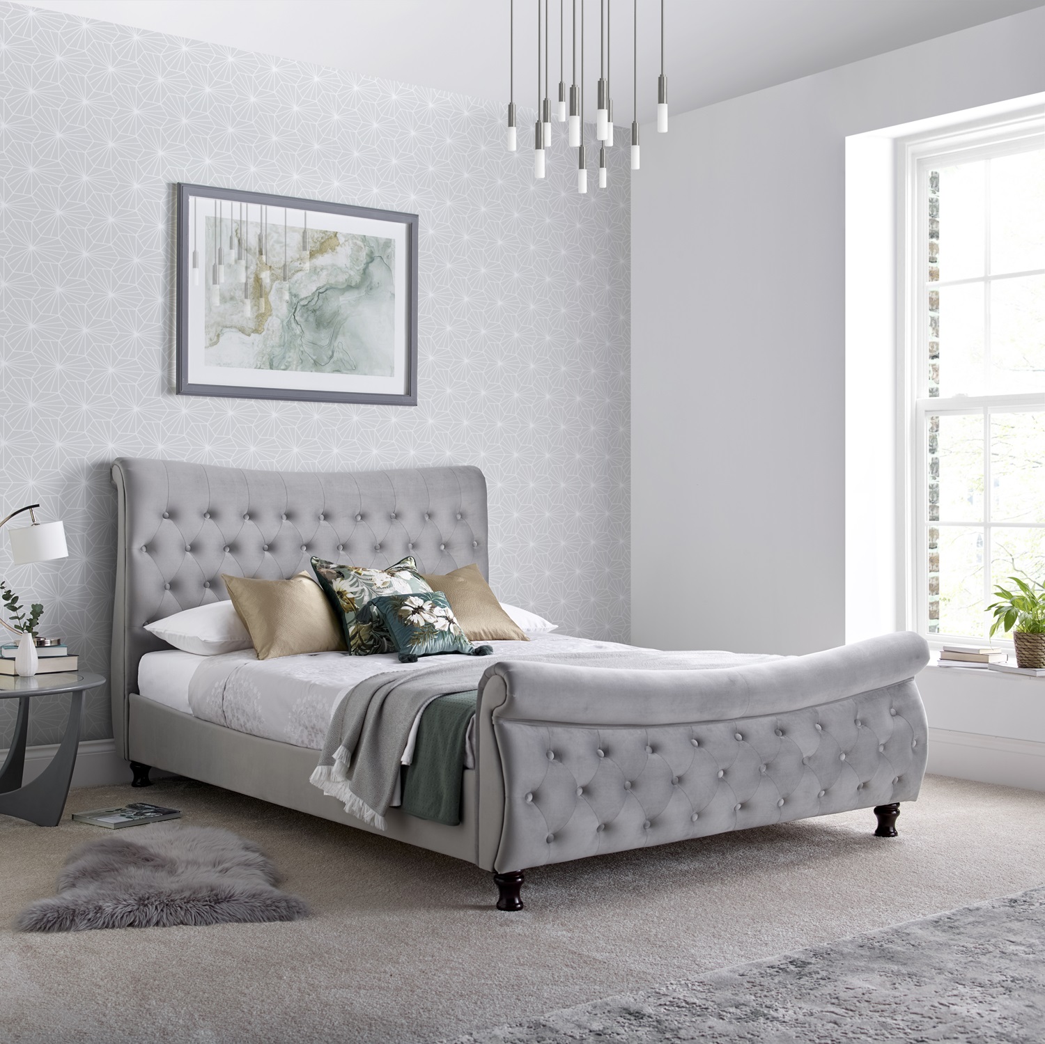 Add opulence and comfort to your bedroom with the Oxford Grey Velvet Chesterfield Sleigh Bed. This modern sleigh bed is upholstered in soft grey velvet and features deep-diamond quilting with buttoned detailing on both the headboard and footboard. The solid frame is supported by elegant wooden feet and includes a sprung slatted base for enhanced mattress support and comfort.