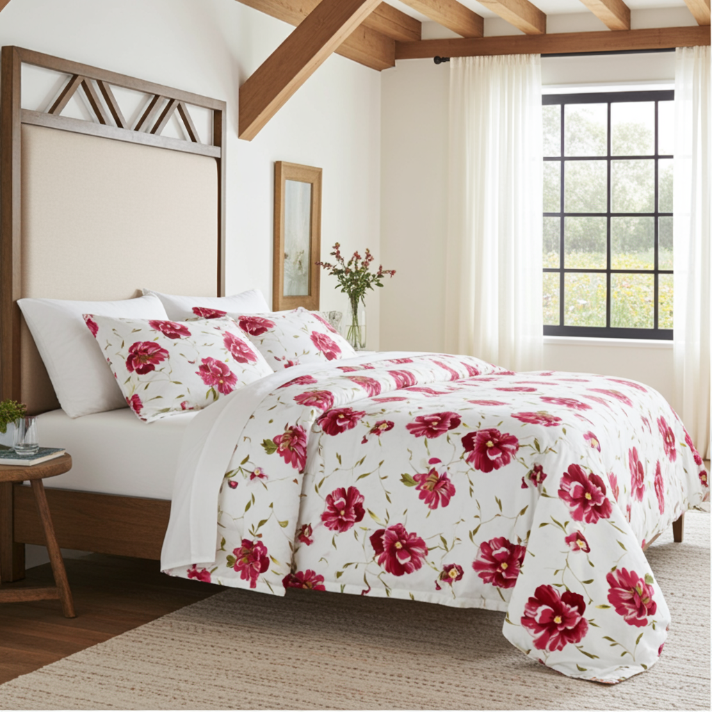 Peony Floral Duvet Cover Set Double – 100% Cotton | Bold Red & Bordo Print