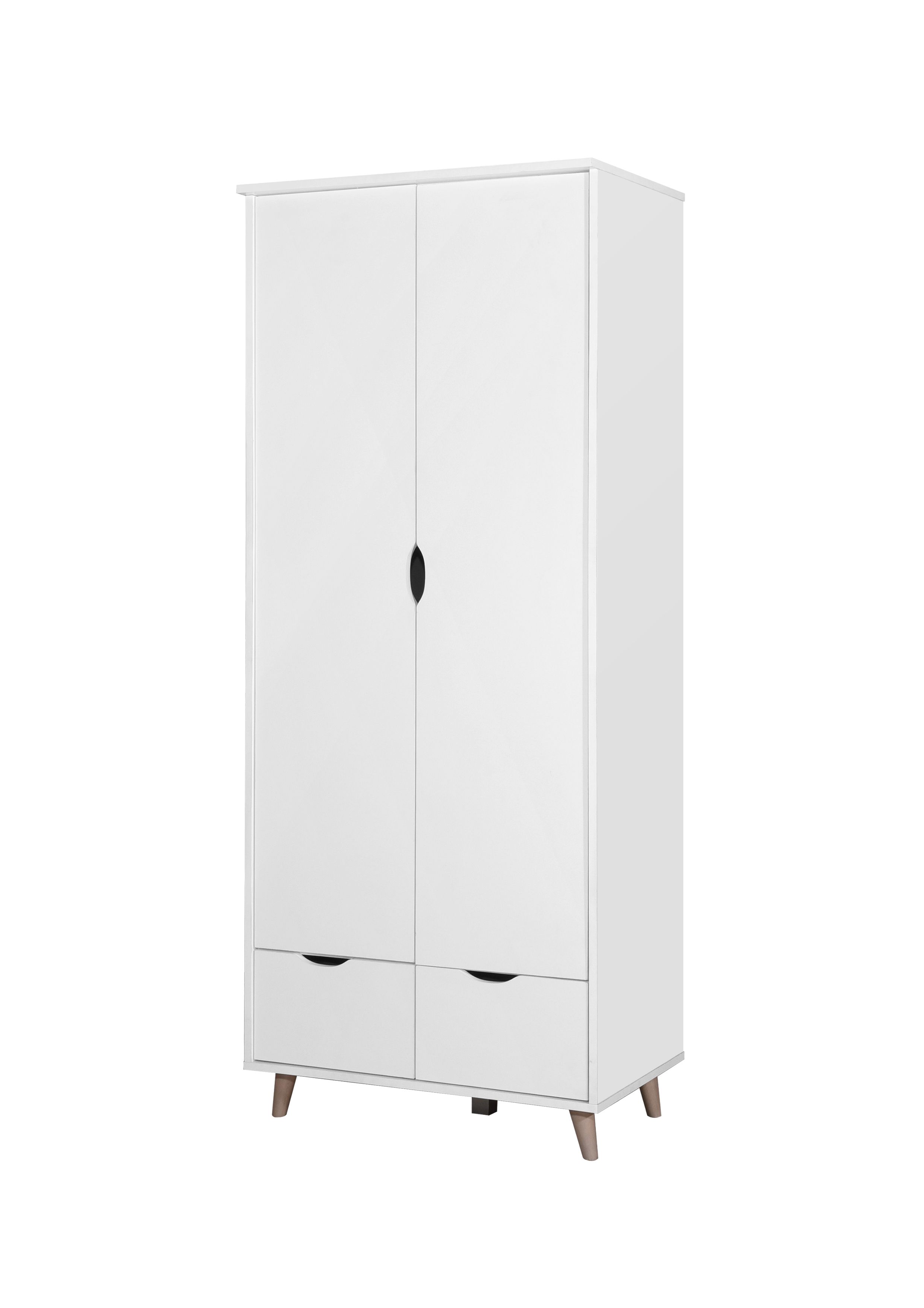 The Pulford contemporary double wardrobe features 2 doors and 2 drawers in a white finish. As part of the Pulford range, this modern wardrobe feautures a shelf and hanging rail with stylish cut out handle designs. The 2 drawers pull out to reveal even more storage perfect for folded garments. The Pulford double wardrobe includes metal hinges and drawer runners, and comes flat packed with easy home self assembly instructions. Contemporary Design Double Wardrobe. White Frame with 2 White Drawers. White Door Fronts with Modern Cut Out Handle Design. Shelf and Hanging Rail Included. Metal Hinges and Drawer Runners. Measures W73cm x H180cm x D46cm. Manufactured using particle board, each item comes flat packed for self assembly at home. Part of the Pulford Furniture Collection.