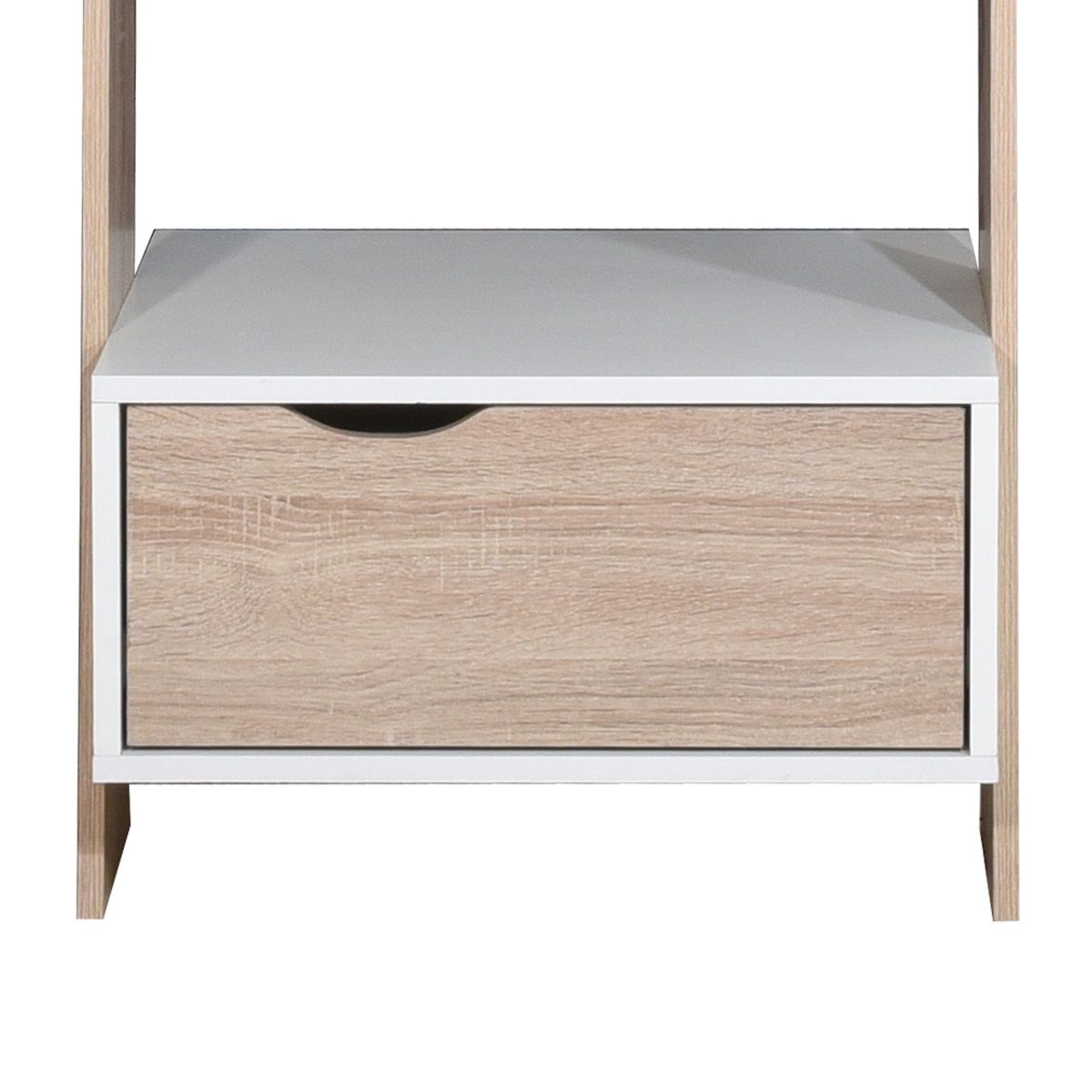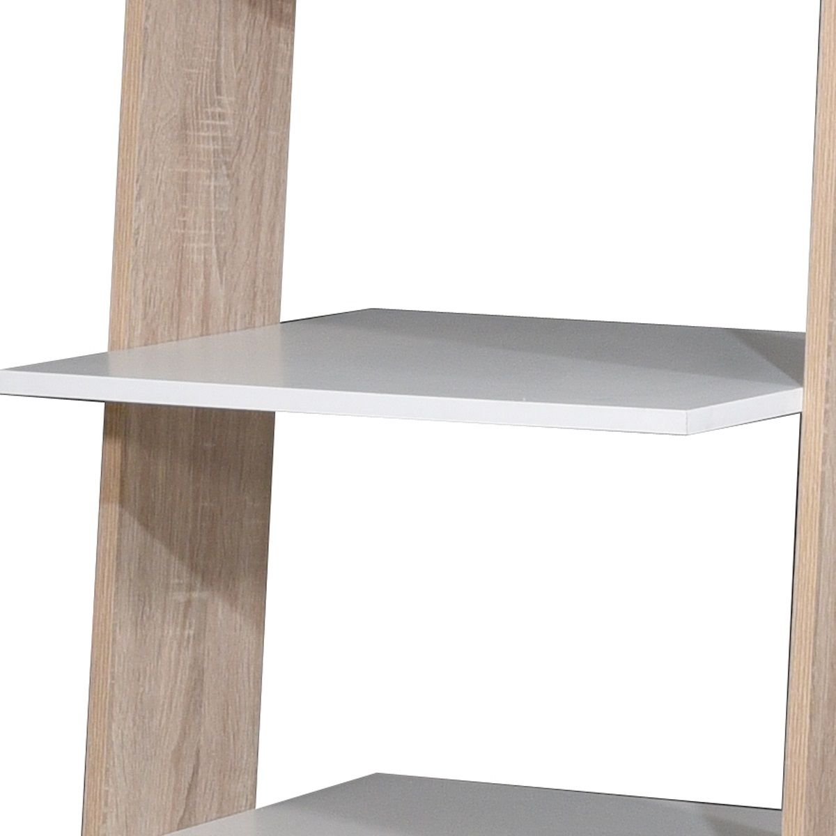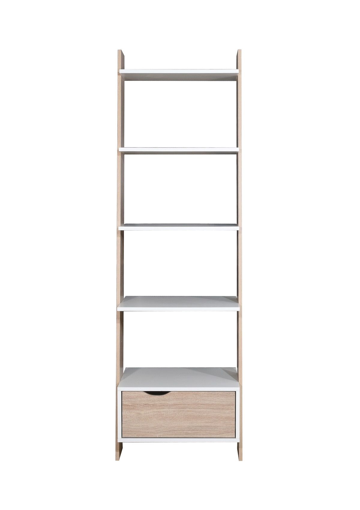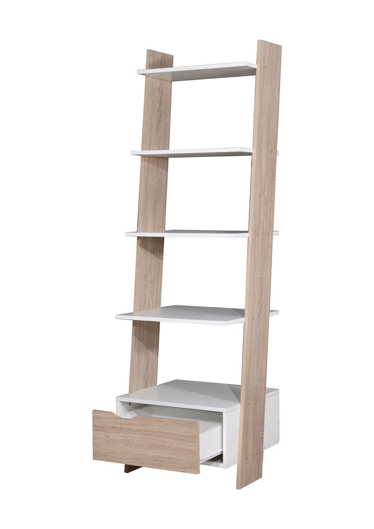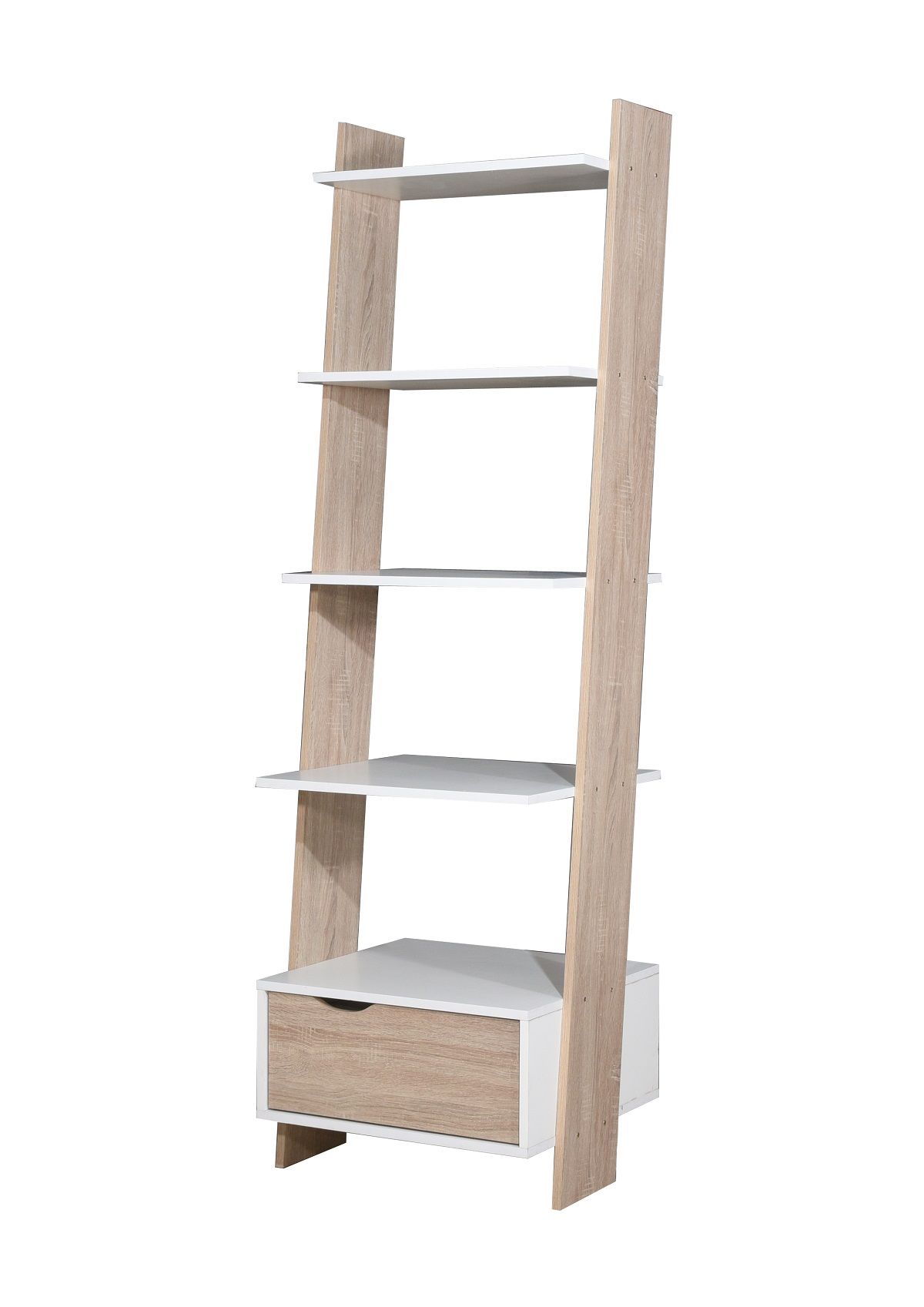 Save space and stay organized with the Ladder Bookshelf. This leaning ladder bookshelf with a drawer, is both unique and practical, it features five graduating open shelves, providing ample room to display pictures, decorative pieces or your book collection. Scandinavian Style. Charming light & oak-effect accents add to the appeal. White & Sonoma Oak Finish. 5-tier shelving and a bottom drawer for storage. Self-assembly required, with easy-to-follow full instructions included. Measures W80cm x H188cm x D40cm. Manufactured using particle board, each item comes flat packed for self assembly at home. Part of the Pulford Furniture Collection.