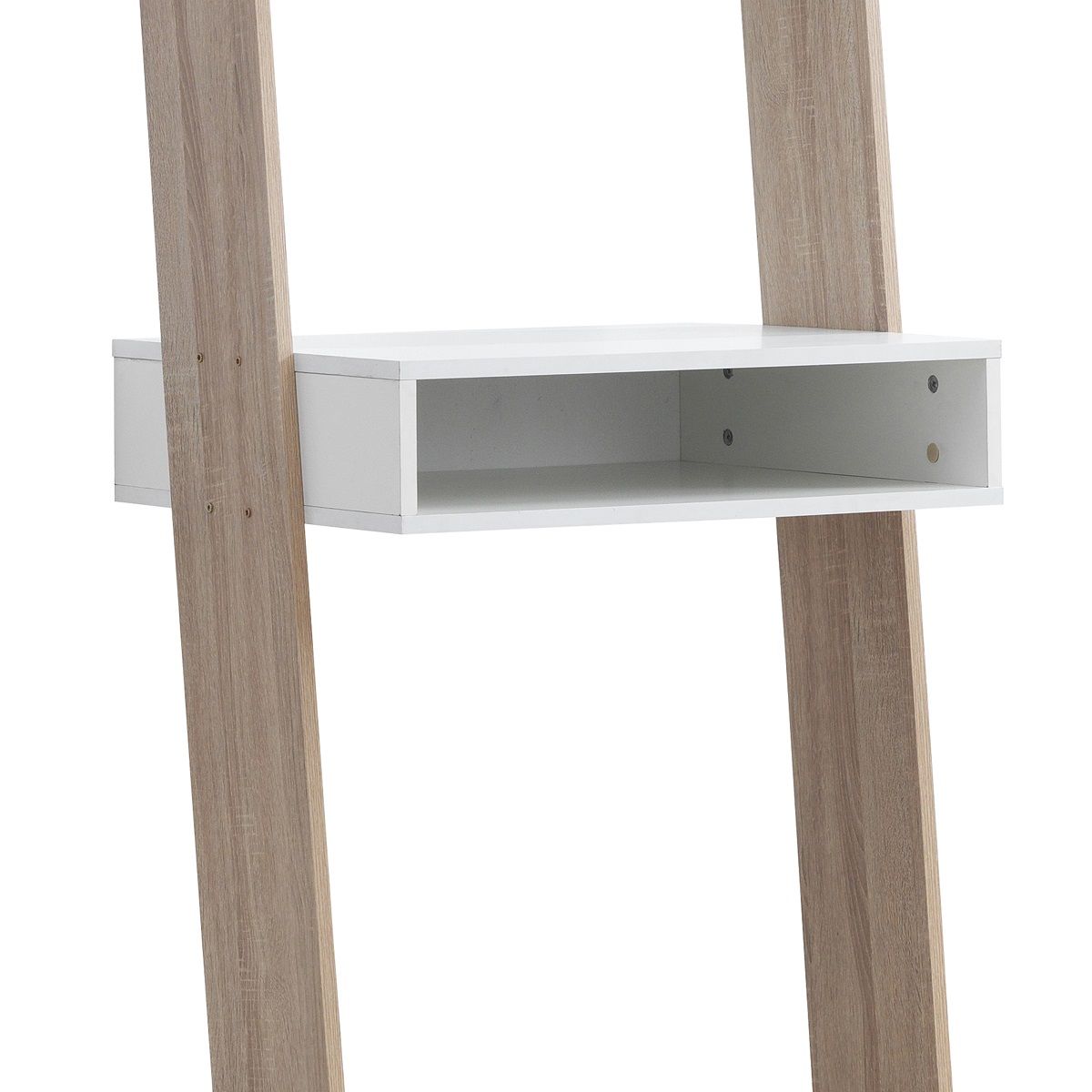 The Pulford tall ladder desk shelving unit is a Scandinavian design in a white and sonoma oak wood effect finish. Our versatile ladder desk can be used as storage/decorative shelving, as a desk or a combination of both. The ladder shelving unit features 4 shelves giving you handy storage in a space saving unit. Scandinavian Design Ladder Bookcase. 4 Tiered Desk Shelving Unit. Measures W65cm x H180cm x D48cm. Manufactured using particle board, each item comes flat packed for self assembly at home. Part of the Pulford Furniture Collection.