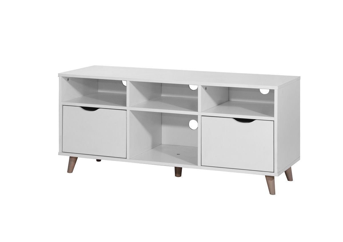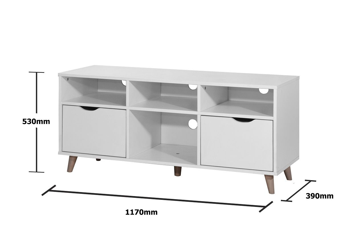 The Pulford TV Cabinet is a Scandinavian design featuring 2 generous drawers with cut out handles and open shelves that will hold all your media devices or some of your favourite ornaments. The shelves, ideal for storing your media players, gaming consoles, and more, have exit holes at the back for cable management, and it also features a storage cabinet too that helps keep clutter out of sight. Scandinavian Design TV Media Cabinet. 2 Generous Drawers with Cut Out Handles. Open Shelves for Extra Storage. Metal Drawer Runners for Smooth Opening. Measures W117cm x H53cm x D39cm. Manufactured using particle board, each item comes flat packed for self assembly at home. Part of the Pulford Living Room Collection.