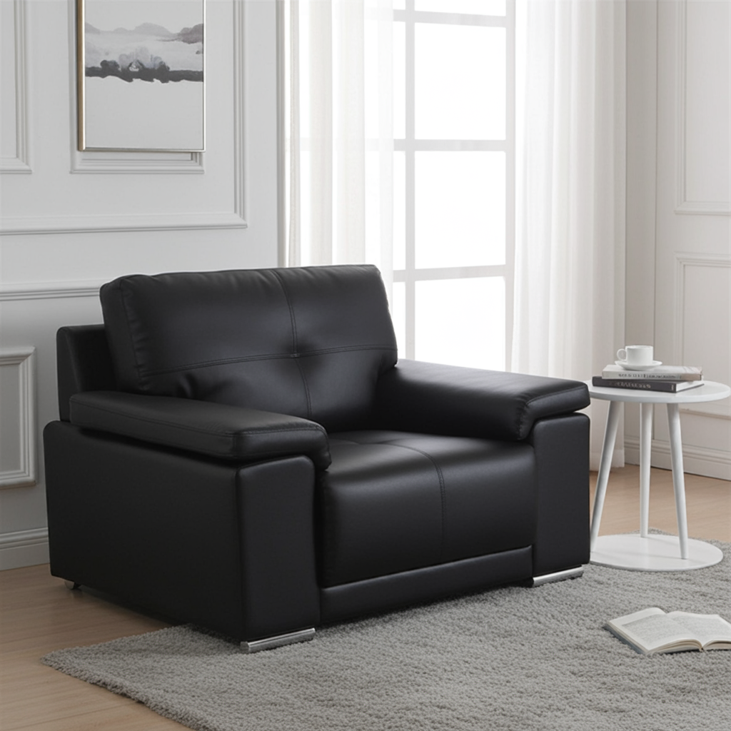The Ranee Bonded Leather & PU 1 Seater – Black is a refined single-seater designed for comfort and contemporary style. Upholstered in a smooth mix of bonded leather and PU, it offers a luxurious feel with easy maintenance. Its compact dimensions make it perfect for small living rooms, reading corners, or professional settings. With minimal assembly required and a sturdy build, this armchair delivers everyday elegance and practicality.