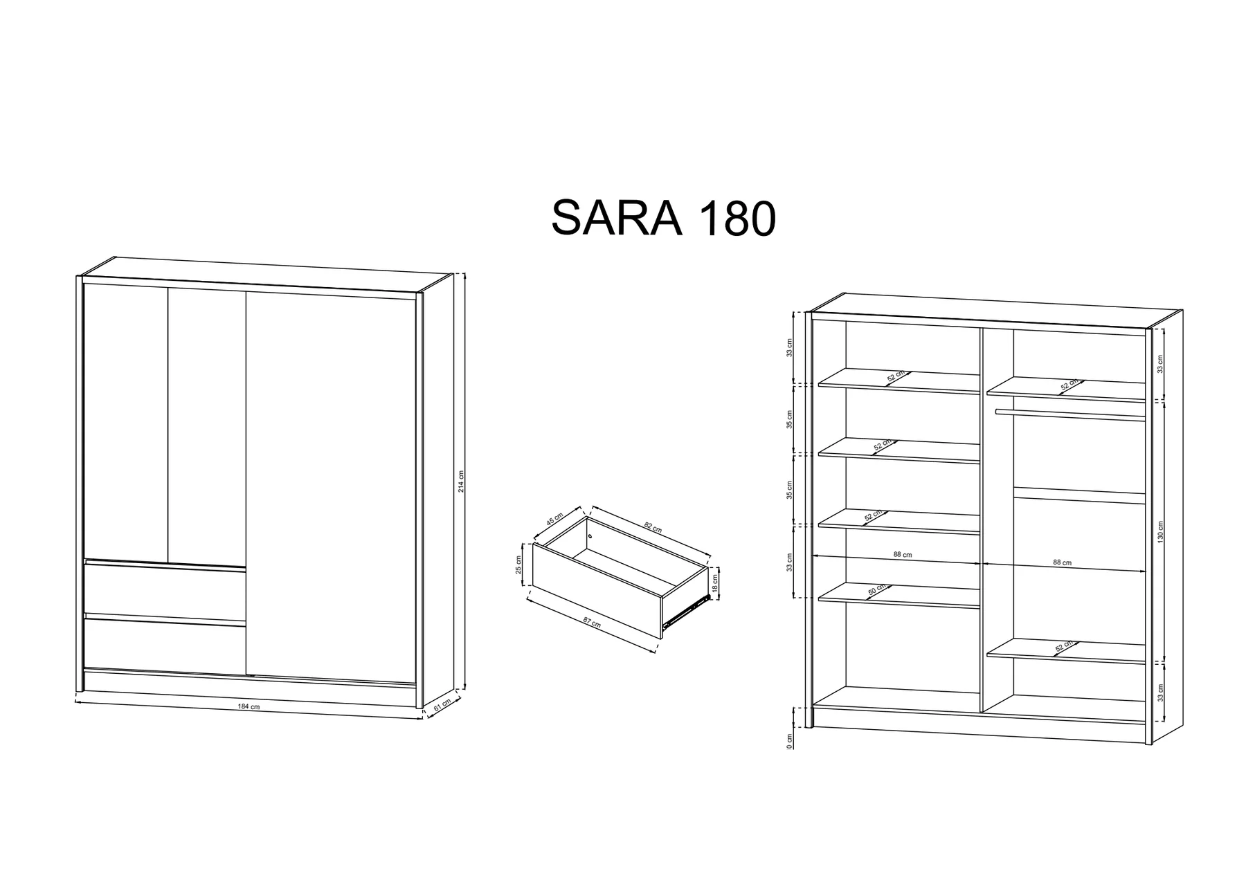 Made from high-quality laminated board with ABS-reinforced carcass, the Sara wardrobe combines timelessness with modernism together. It is distinguished by its handle-free structure and multiple storage options in the form of two drawers, six compartments and one hanging section. This wardrobe is generously spacious and capable of accommodating the belongings of up to two individuals at once.