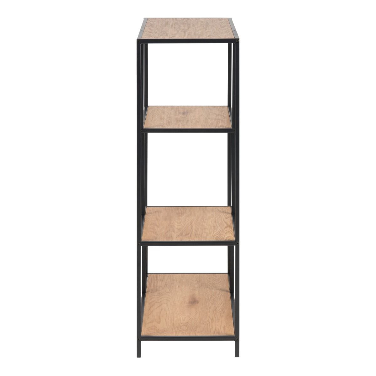 Accentuate your living space with this contemporary bookcase, which features a matte black powder-coated steel frame and base. It includes three shelves with a matt wild oak finish, offering a stylish storage solution. The asymmetrical design adds a creative twist, making this piece a statement of modern design and practicality.