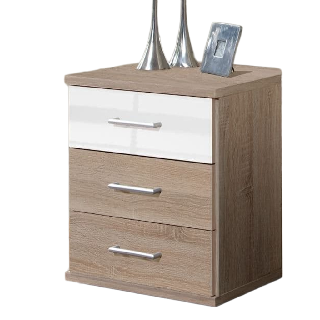 Refresh your sleep space with the Selby 3 Drawer Bedside Cabinet in White Gloss and Oak Effect, a modern and practical unit designed for contemporary interiors. This compact table offers: