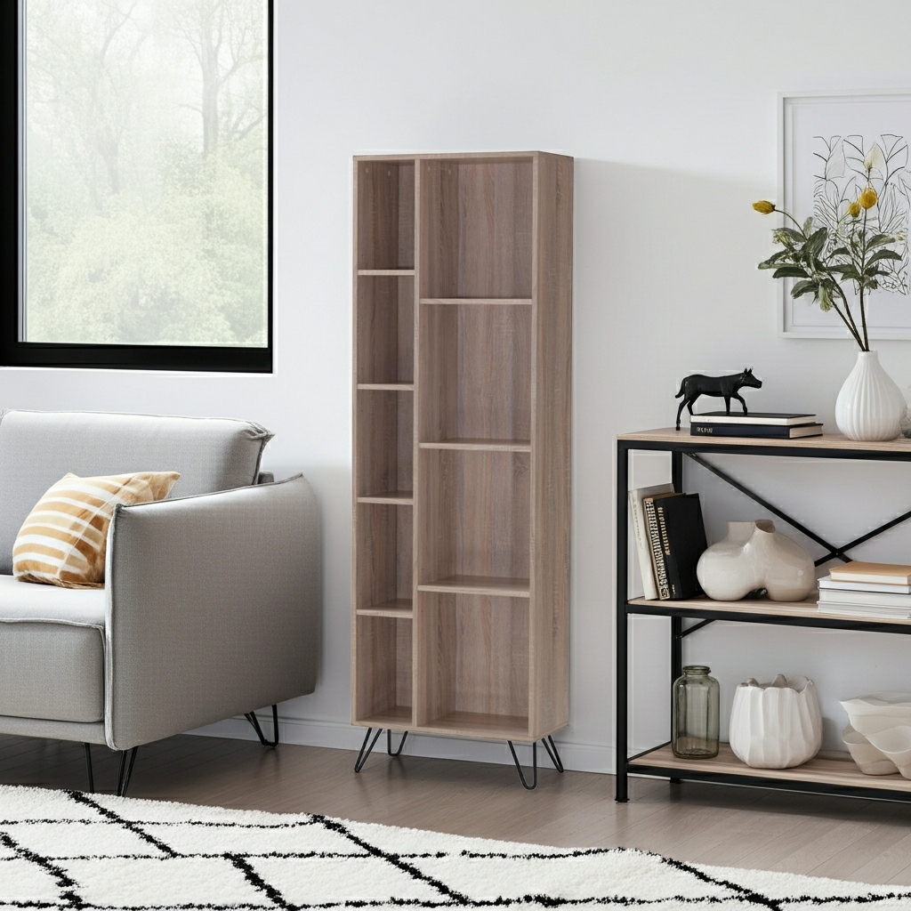 Sonoma Narrow Bookcase – Oak Effect & Black Metal Legs | Compact Vertical Storage