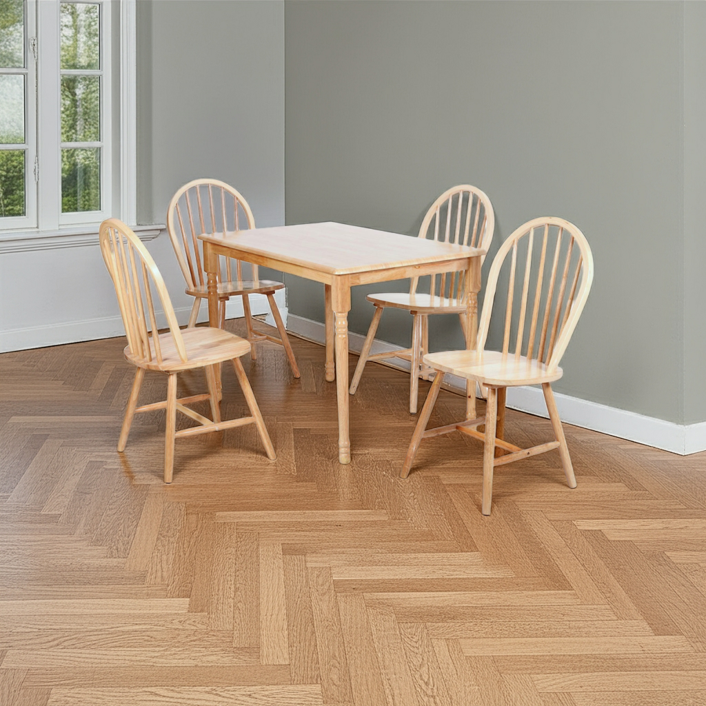 The Sutton Dining Set – Natural is a timeless addition to any dining space. Made entirely from solid rubberwood, it features a rectangular table and four matching chairs, all finished in a warm natural tone. The compact size makes it perfect for smaller homes, breakfast nooks, or casual dining areas. With sturdy construction and clean lines, this set offers both style and everyday functionality.