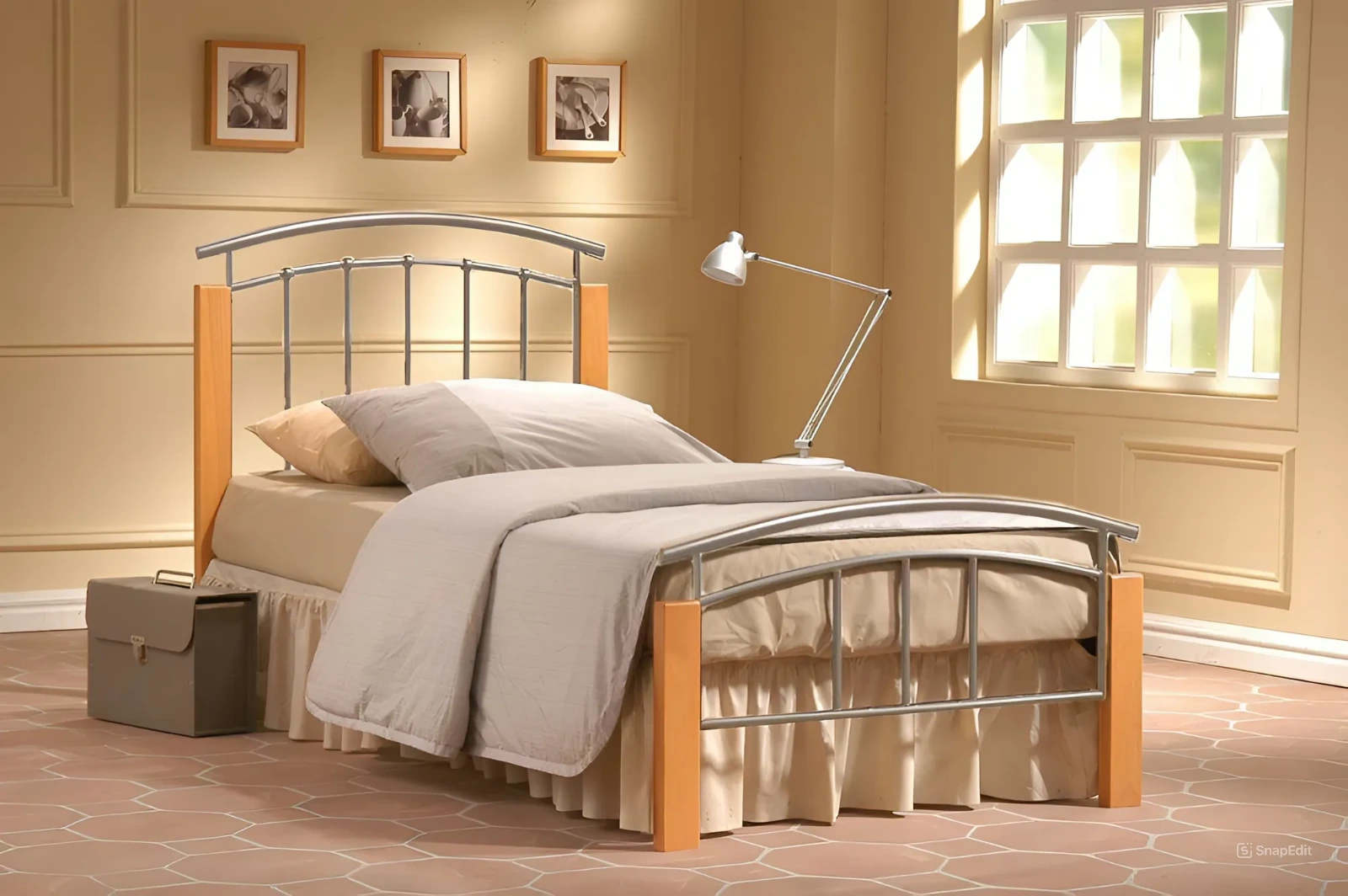 Tetras Single Bed Frame – Silver Metal with Beech Accents