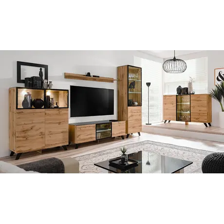 A practical 4-in-1 living room set that combines functionality, looks and glamour. It includes two fancy display cabinets, one TV cabinet and one wall shelf. All the furniture pieces are made from 16mm laminated board with push-to-open mechanism replacing traditional handles. The set is aesthetically finished in Oak Wotan with stunning black decor, and powered LED lights that come along with the purchase.