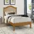 This modern bed features a sleek design and comfortable sand-colored fabric upholstery, perfect for a restful night's sleep.