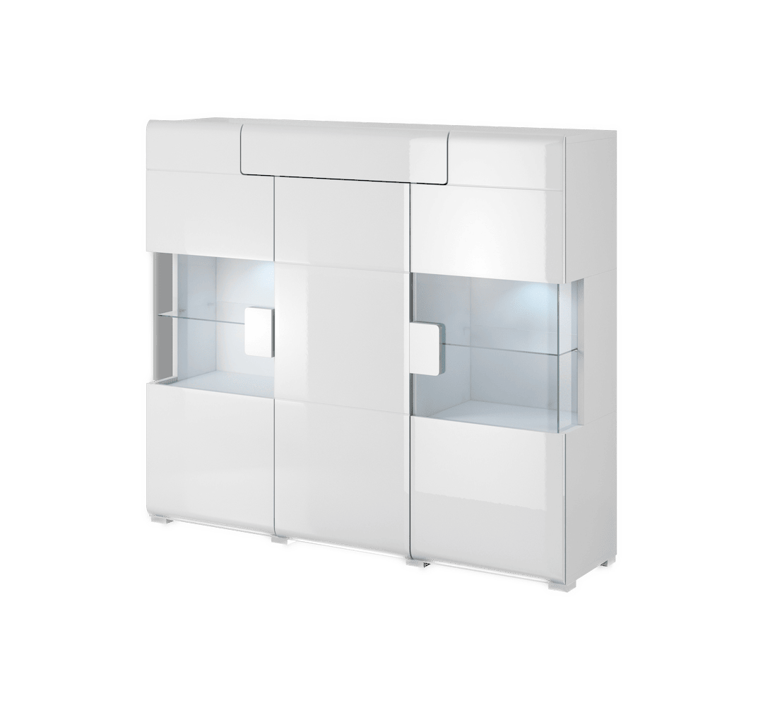 The Toledo display sideboard will impress with its high-quality craftsmanship and modern design. It is made from 16mm laminated board and offers three hinged doors, two partially-glazed, one drawer and a combination of wooden and glass shelves for storage. It is available in two different colours - white gloss or grey matt with San Remo Oak.