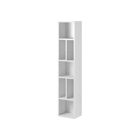 Tall white or grey matte bookcase with oak insets includes vertical and horizontal compartments so you can artistically showcase items using little floor space.