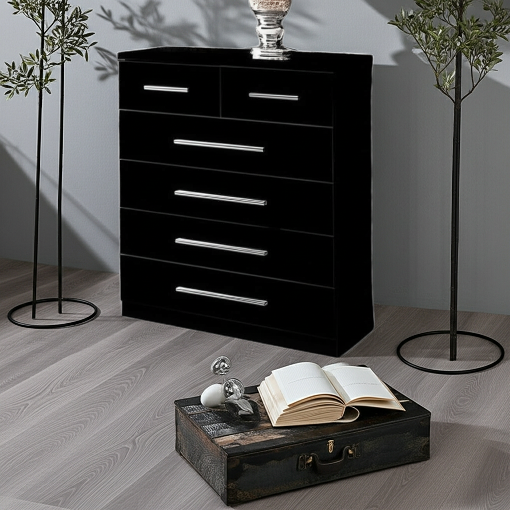 Add bold elegance and functional storage to your bedroom with the Topline Chest 4+2 – Black. This contemporary chest features four full-width drawers and two compact top drawers, ideal for organizing everything from clothing to personal items. The black finish adds a sleek, modern touch that complements monochrome, industrial, or minimalist interiors.