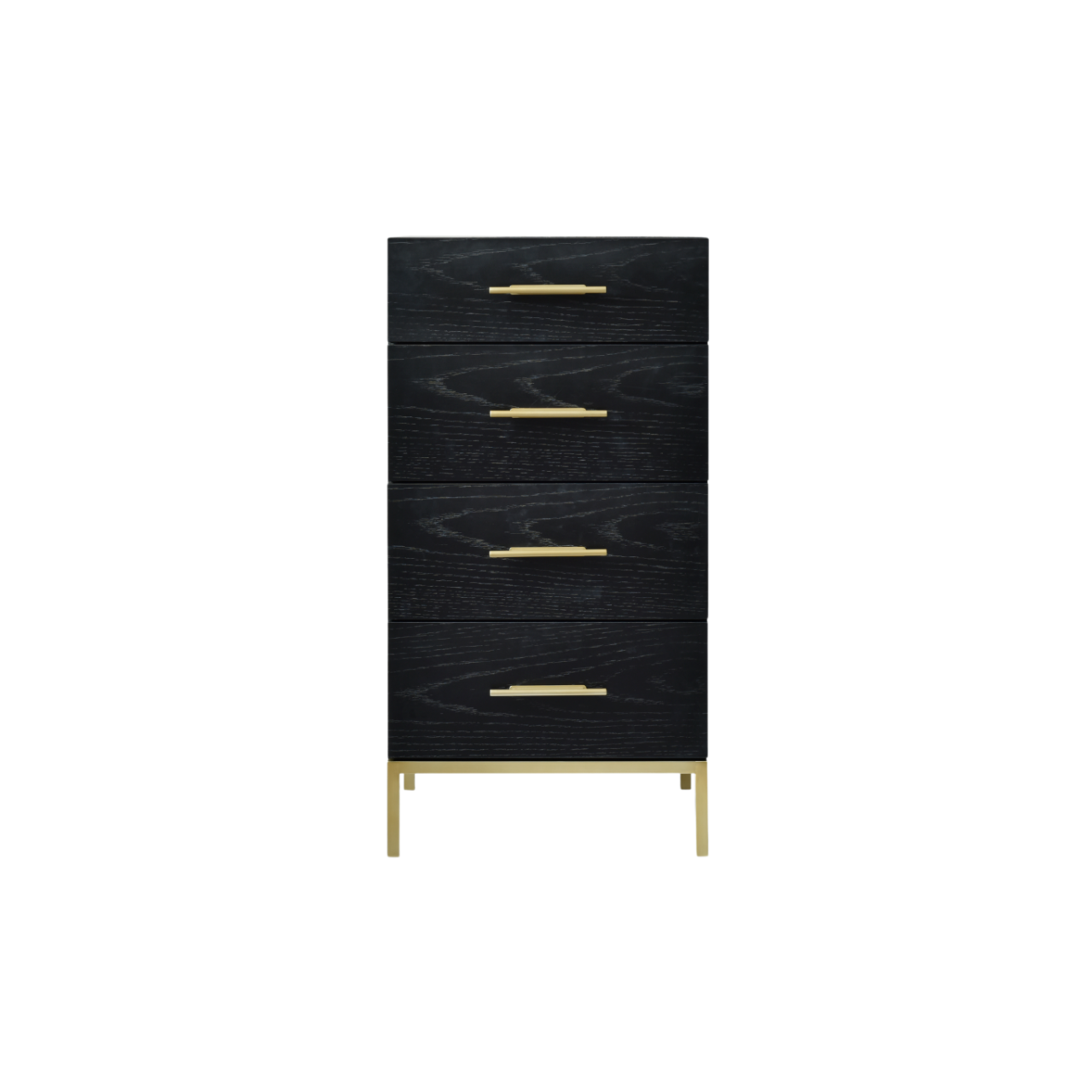 The Tulip Tall Boy is a beautifully designed narrow chest that adds the perfect finishing touch to bedrooms with limited space. Its black oak finish and brass detailed handles create a refined, modern look that instantly elevates any interior. With four drawers and premium construction, it offers both style and everyday practicality.