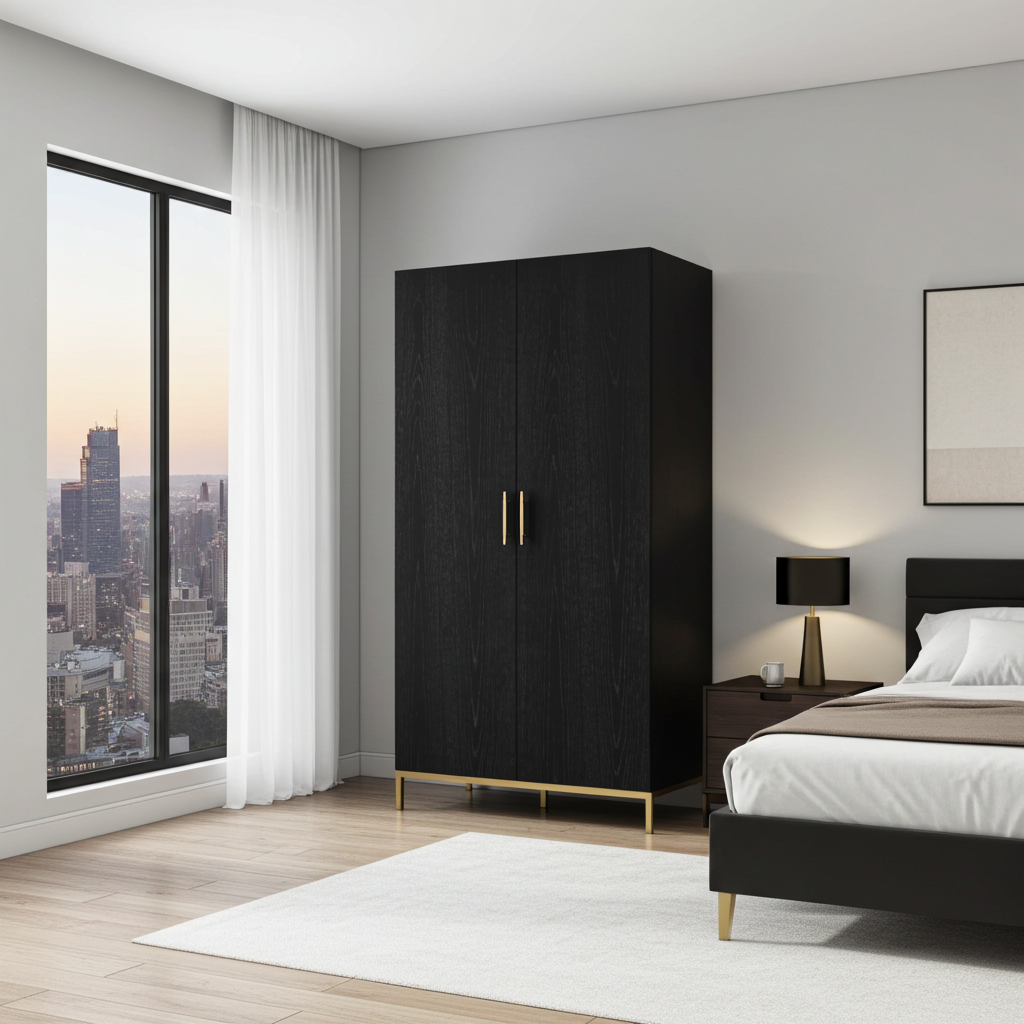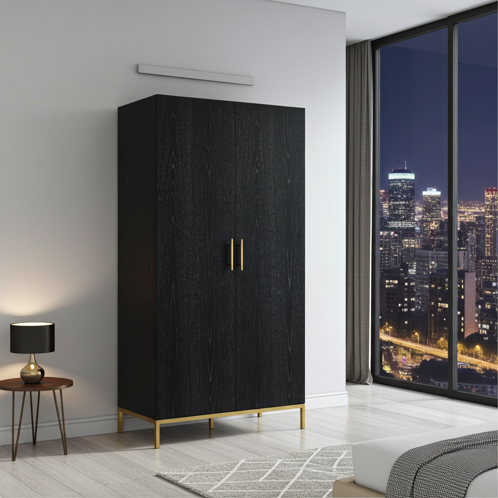 The Tulip 2‑Door Wardrobe is a beautifully designed storage piece that brings elegance and practicality to any bedroom. Finished in a rich black oak veneer and complemented by sleek brass detailed handles, it delivers a premium, modern aesthetic. The fine wood markings and luxurious brass frame create a striking contrast, making this wardrobe a standout feature in contemporary interiors.