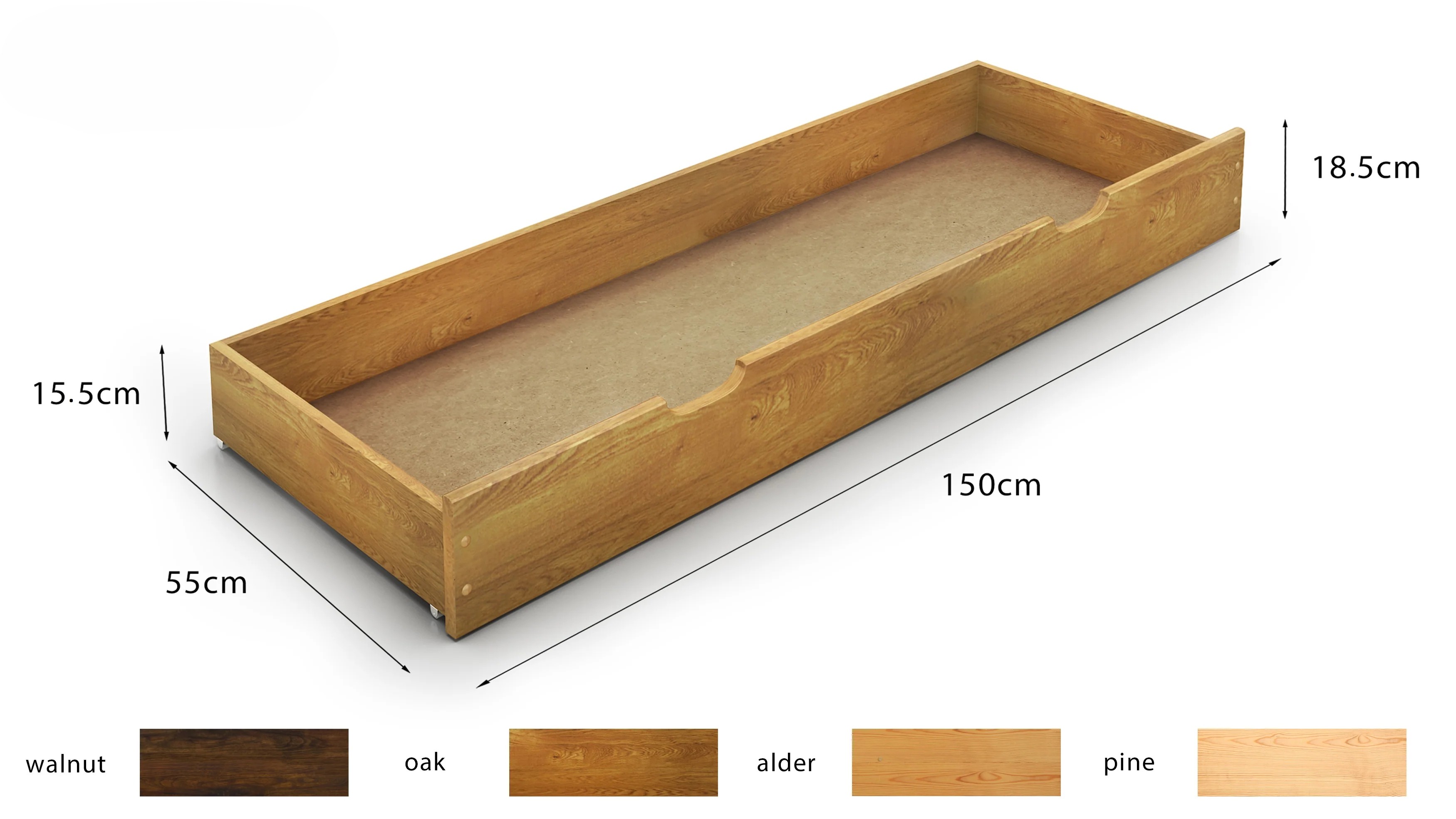 Tip: If you have a bedside cabinet next to the bed, we recommend choosing an underbed drawer of 150cm maximum length, for the best fit.