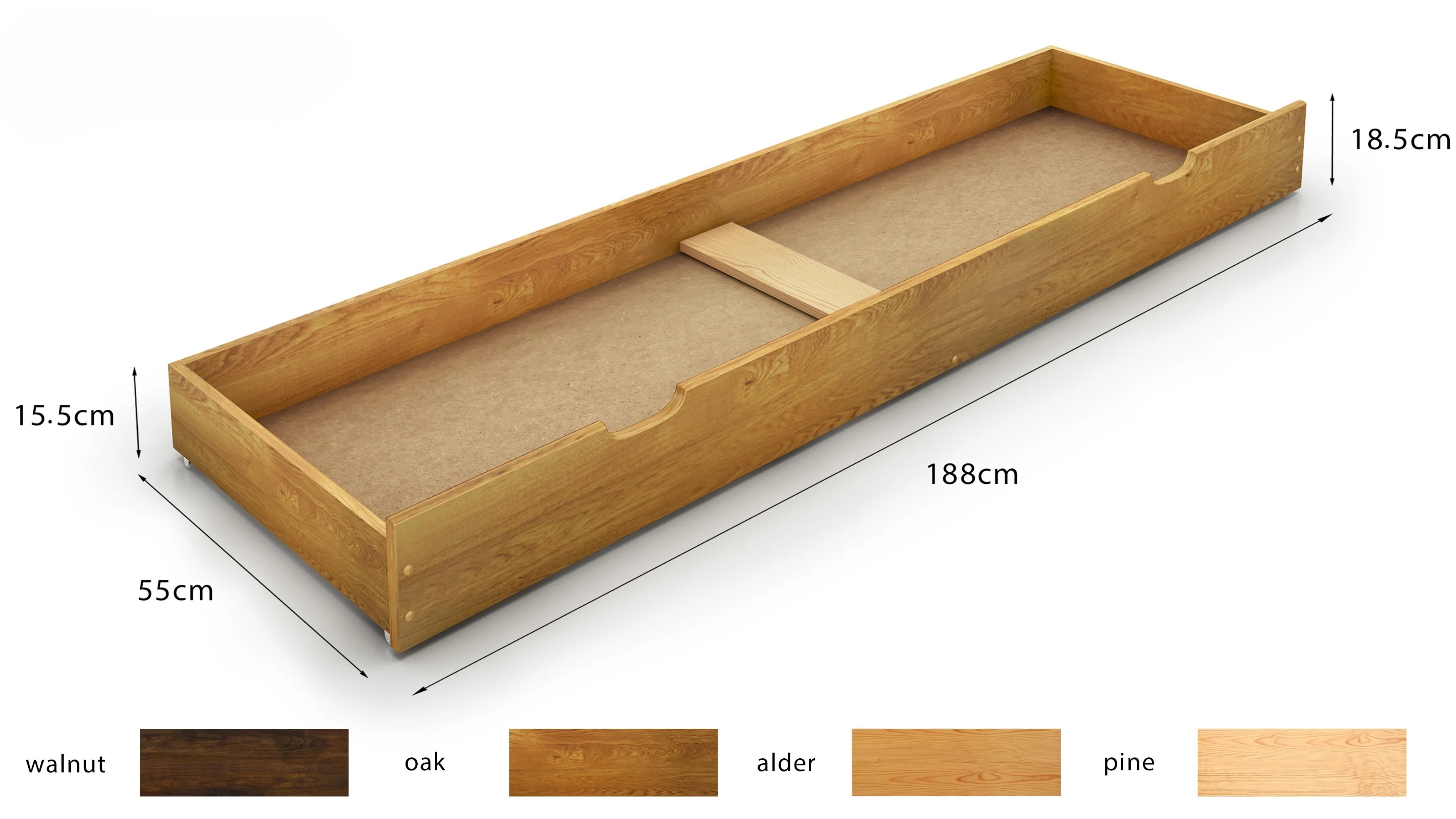 Tip: If you have a bedside cabinet next to the bed, we recommend choosing an underbed drawer of 150cm maximum length, for the best fit.