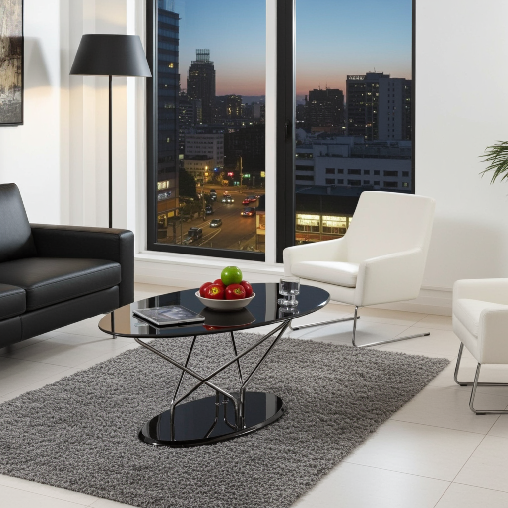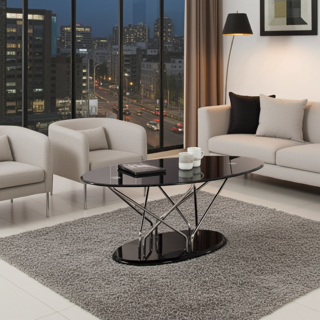 The Uplands Glass Coffee Table – Chrome & Black blends bold contrast with minimalist design. Its black tempered glass top adds depth and drama, while the chrome-finished frame delivers sleek sophistication. The high gloss base enhances its modern appeal, making it a standout piece in monochrome or industrial-style living rooms. Measuring 1200 mm wide, it offers generous surface space for drinks, décor, or coffee table books.
