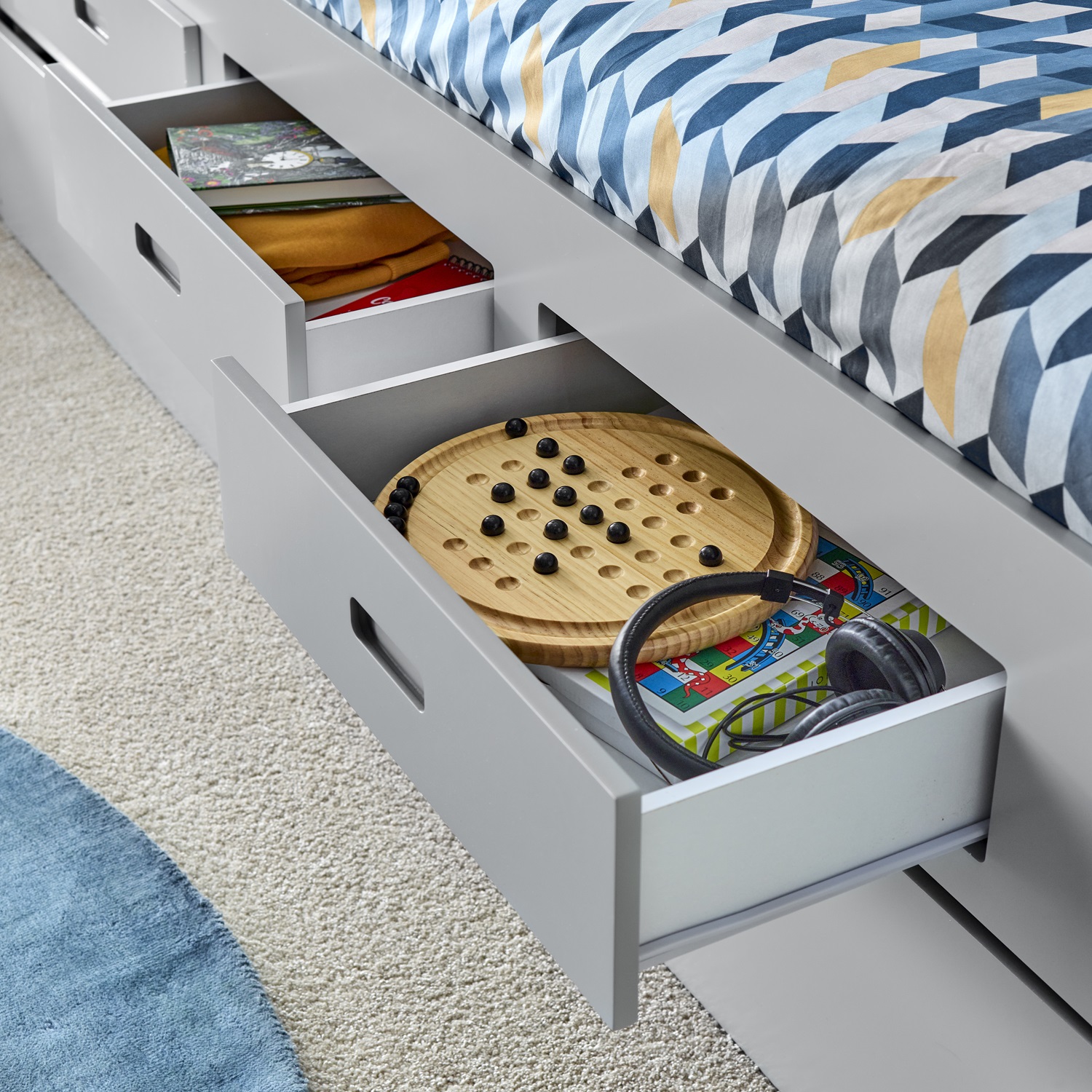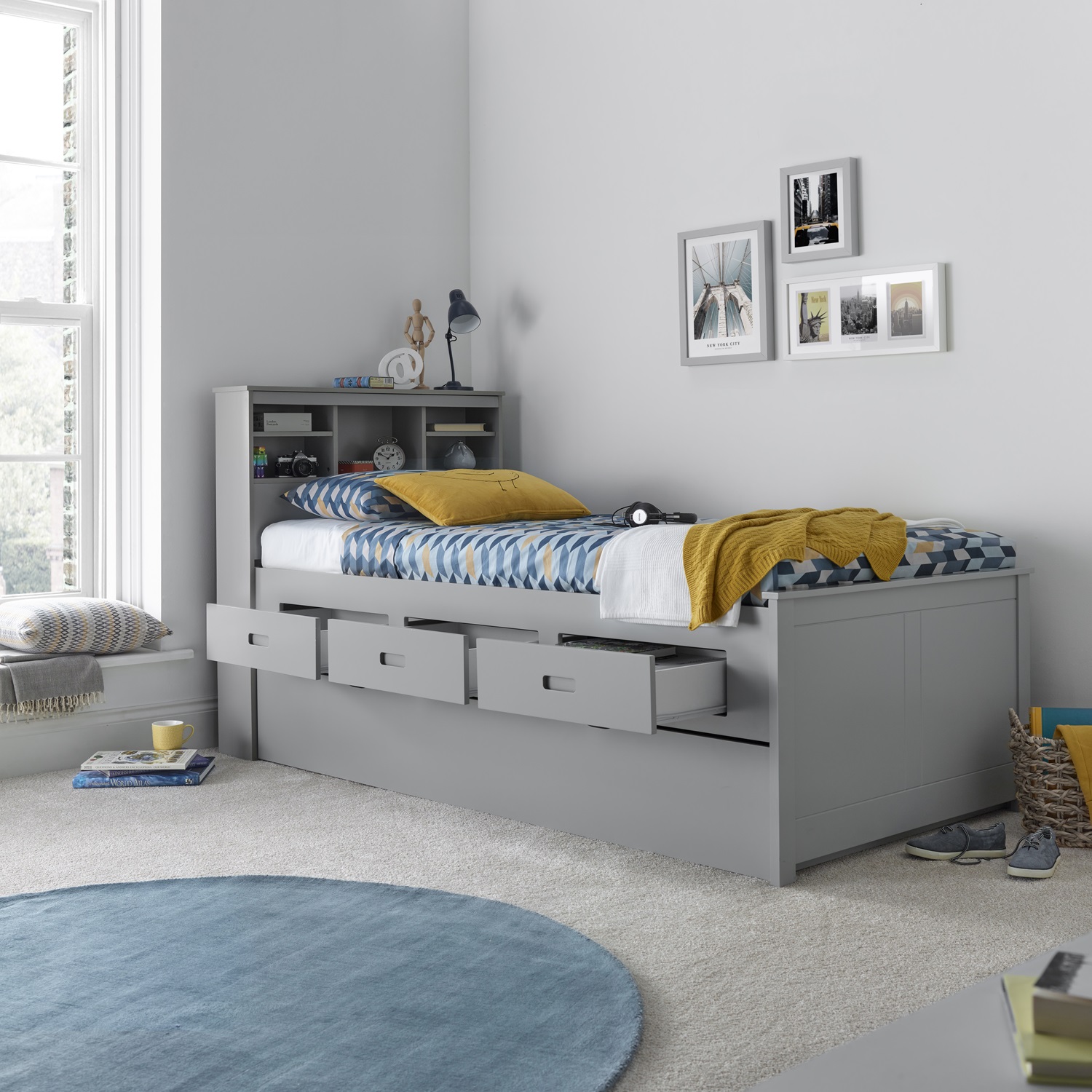 The Veera is a guest bed unlike any other. With its modern and compact design this bed offers an aesthetic design and ample storage. The headboard (which can be assembled on either side) features shelves which are perfect for containing books and any other trinkets you may have. In addition to this, the bed features 3 pull-out drawers and an optional under-bed trundle which can double up as another large storage drawer. With the trundle the Veera Guest Bed transforms from a single bed frame to a bed which supports two sleepers.
