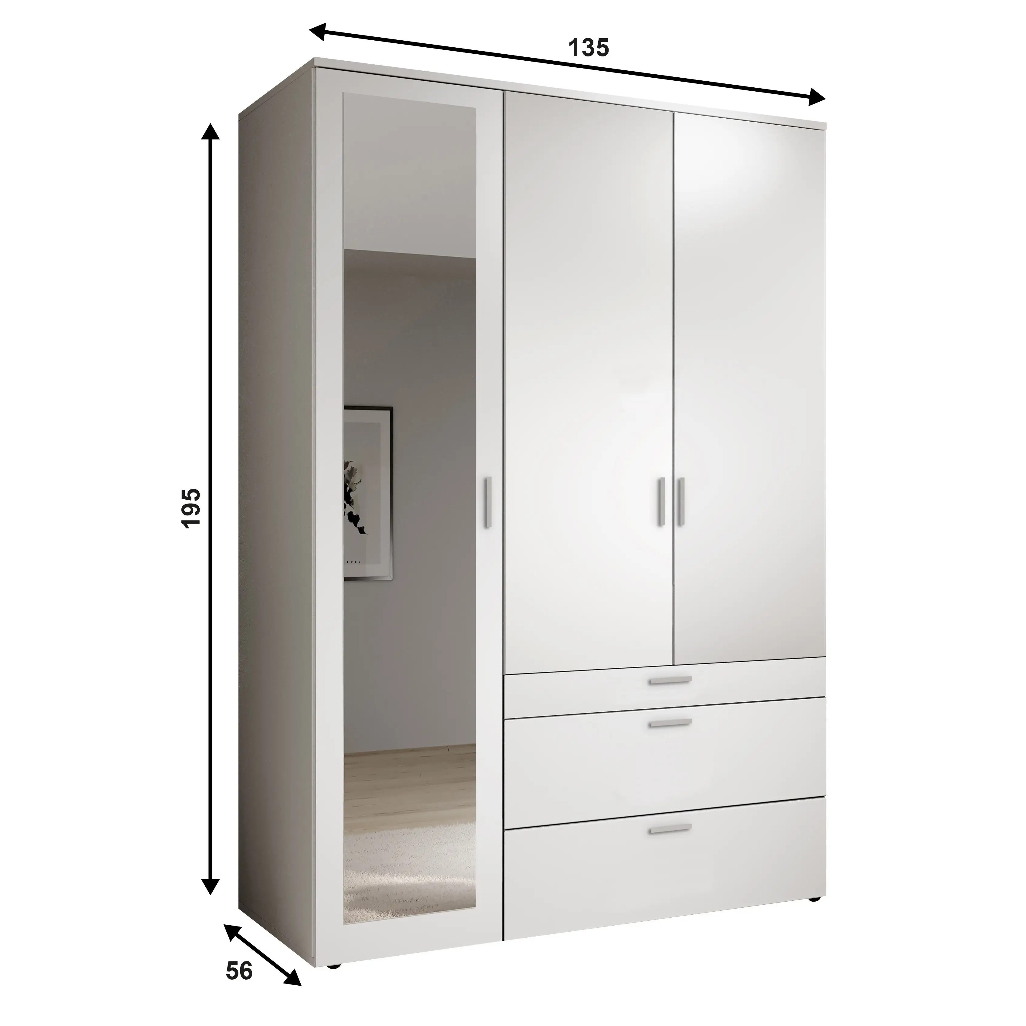 - Doors – 3 hinged doors (1 mirrored)