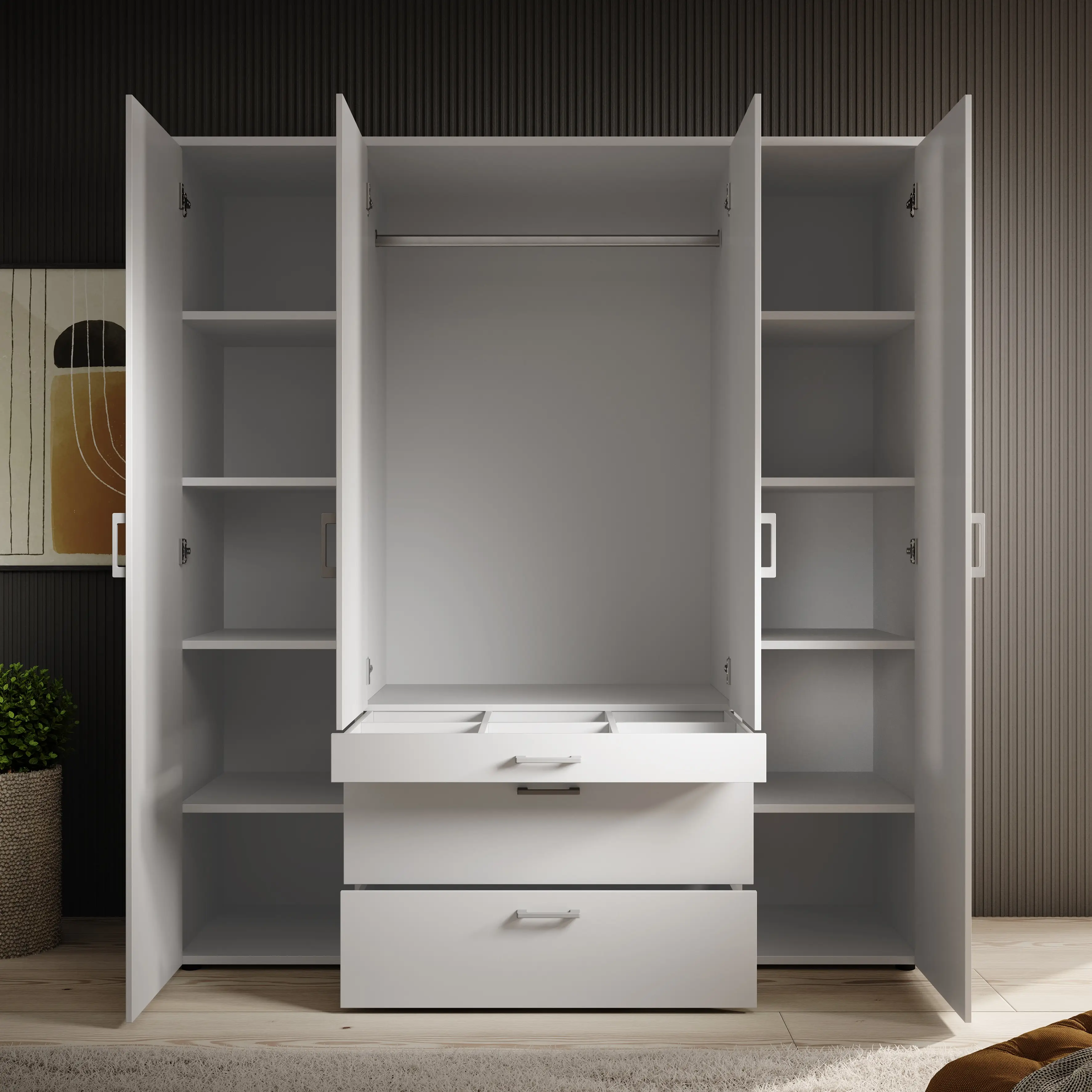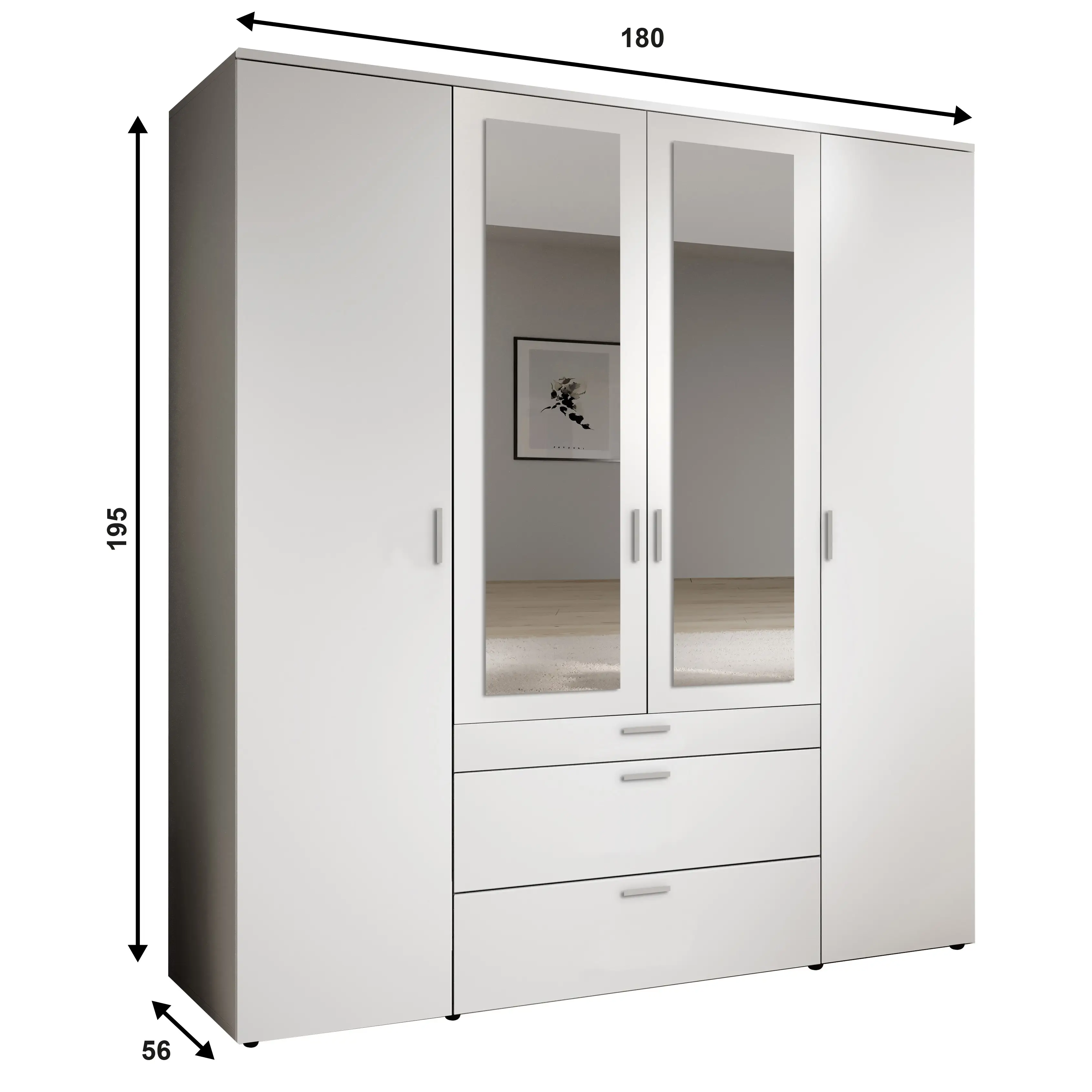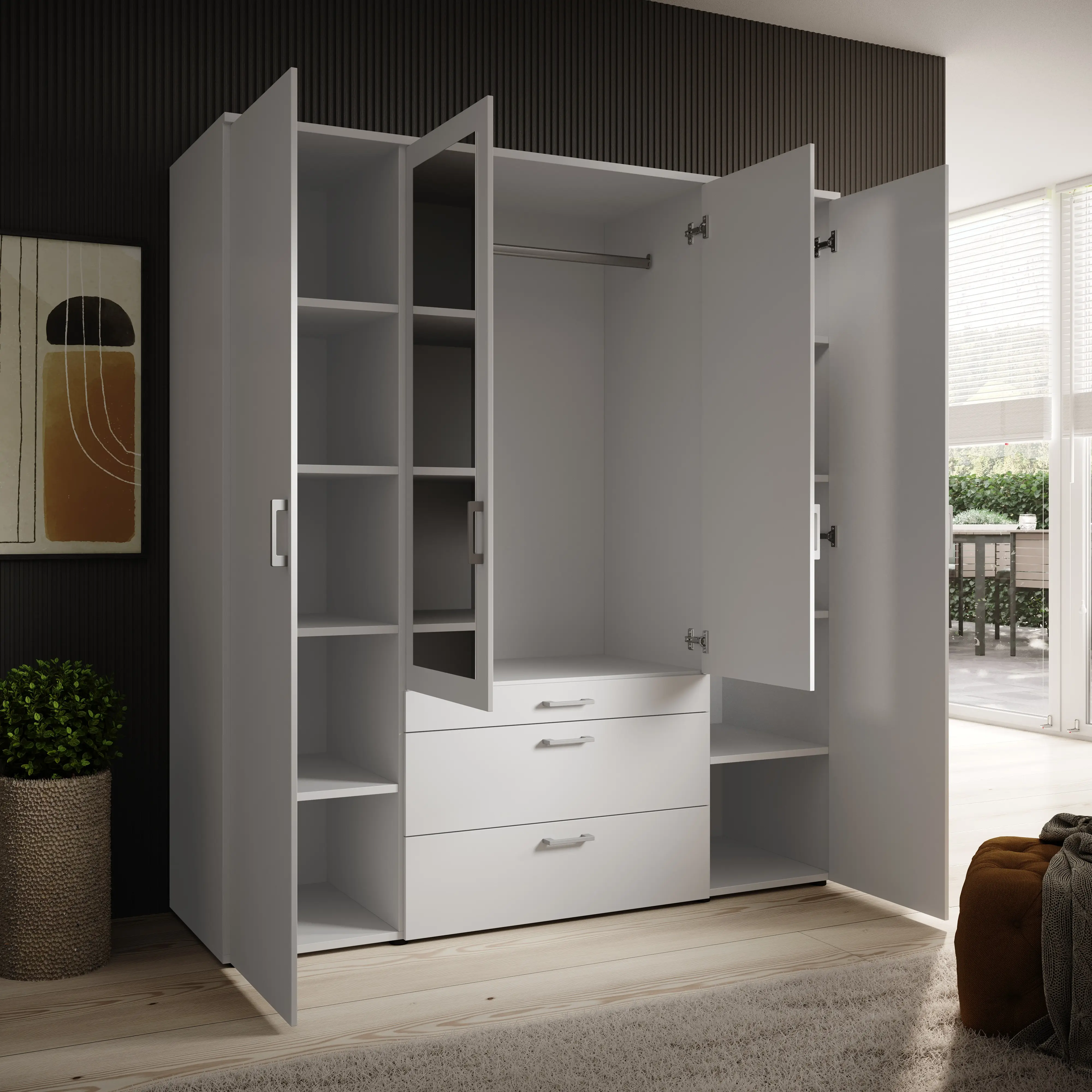 The Vesala 4 Hinged Door Wardrobe – White Matt with Mirror offers a clean, contemporary look with generous storage. Its four hinged doors—two of which are mirrored—open to reveal eight shelves, three drawers, and a hanging rail. The white matt finish adds brightness and versatility, while silver plastic handles provide a sleek accent. Crafted from high-quality laminated board, this wardrobe is built for durability and everyday use.
