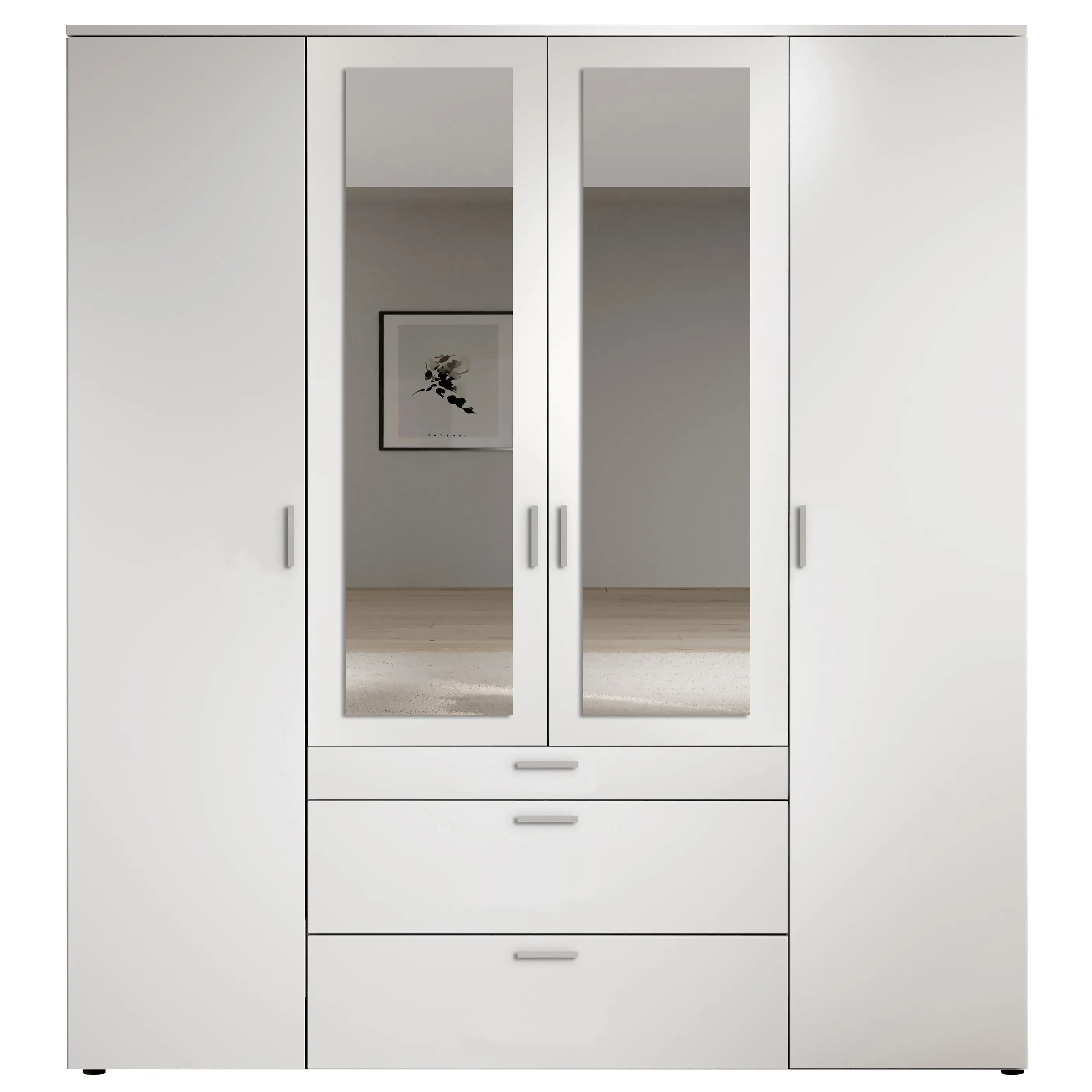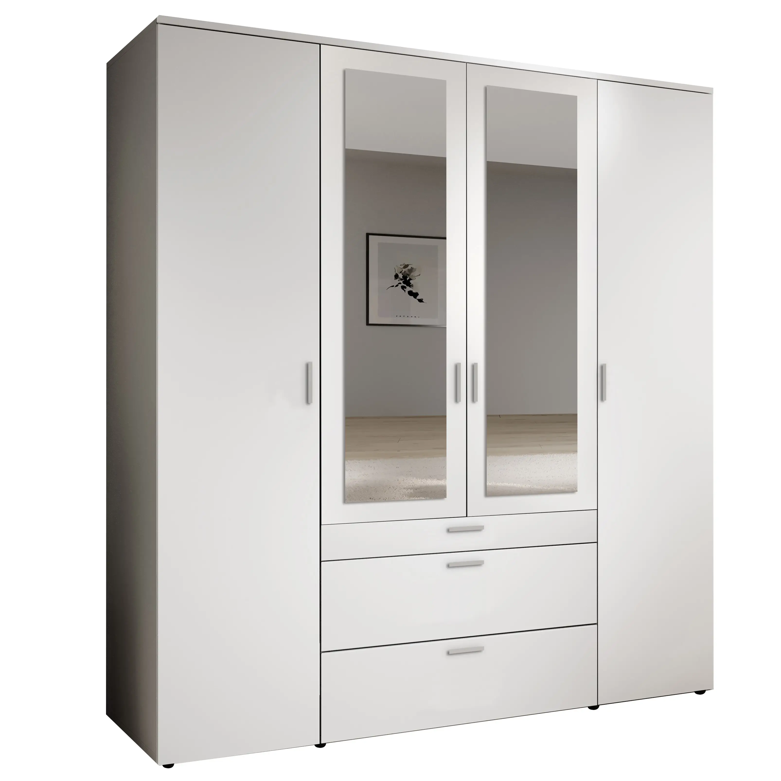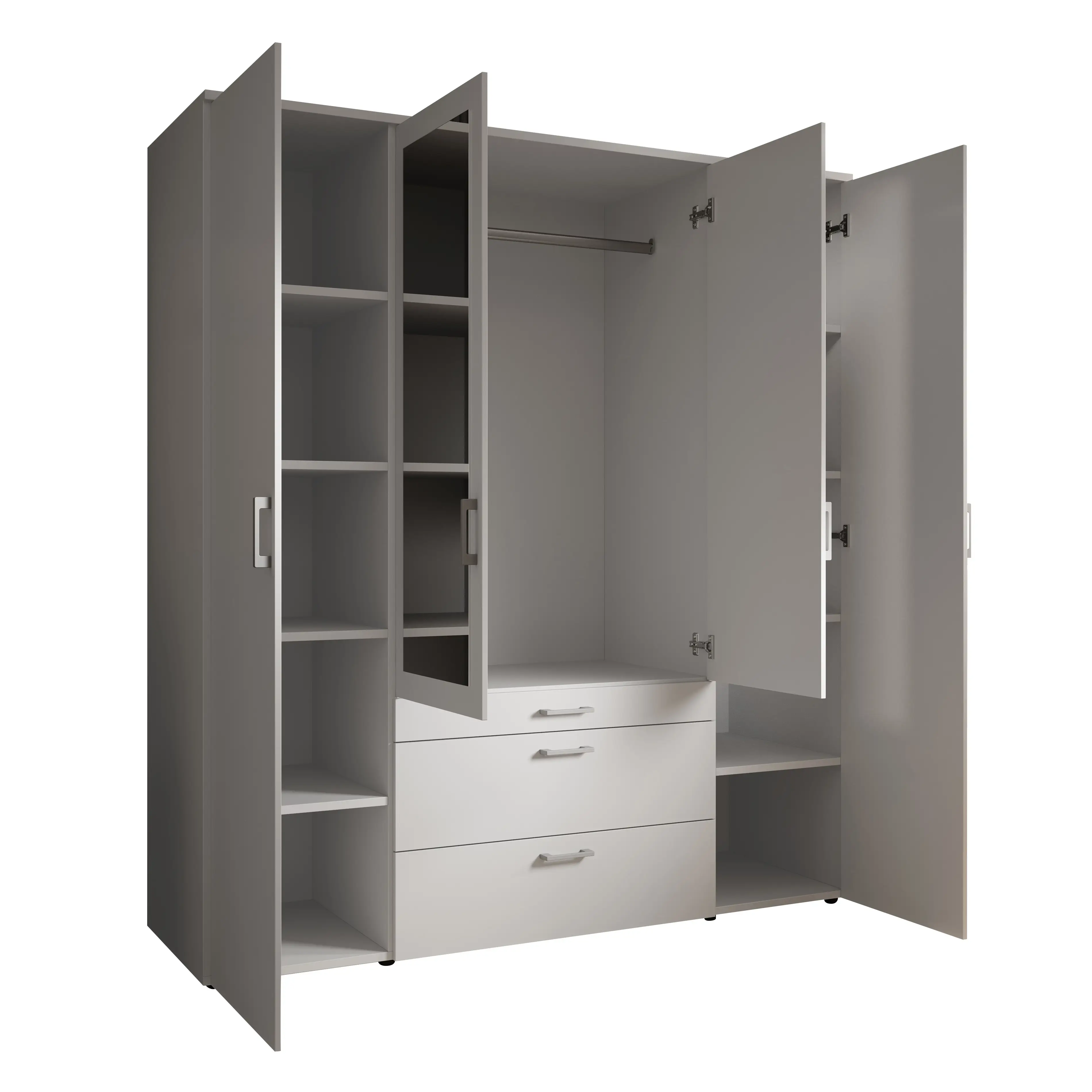 The Vesala 4 Hinged Door Wardrobe – White Matt with Mirror offers a clean, contemporary look with generous storage. Its four hinged doors—two of which are mirrored—open to reveal eight shelves, three drawers, and a hanging rail. The white matt finish adds brightness and versatility, while silver plastic handles provide a sleek accent. Crafted from high-quality laminated board, this wardrobe is built for durability and everyday use.
