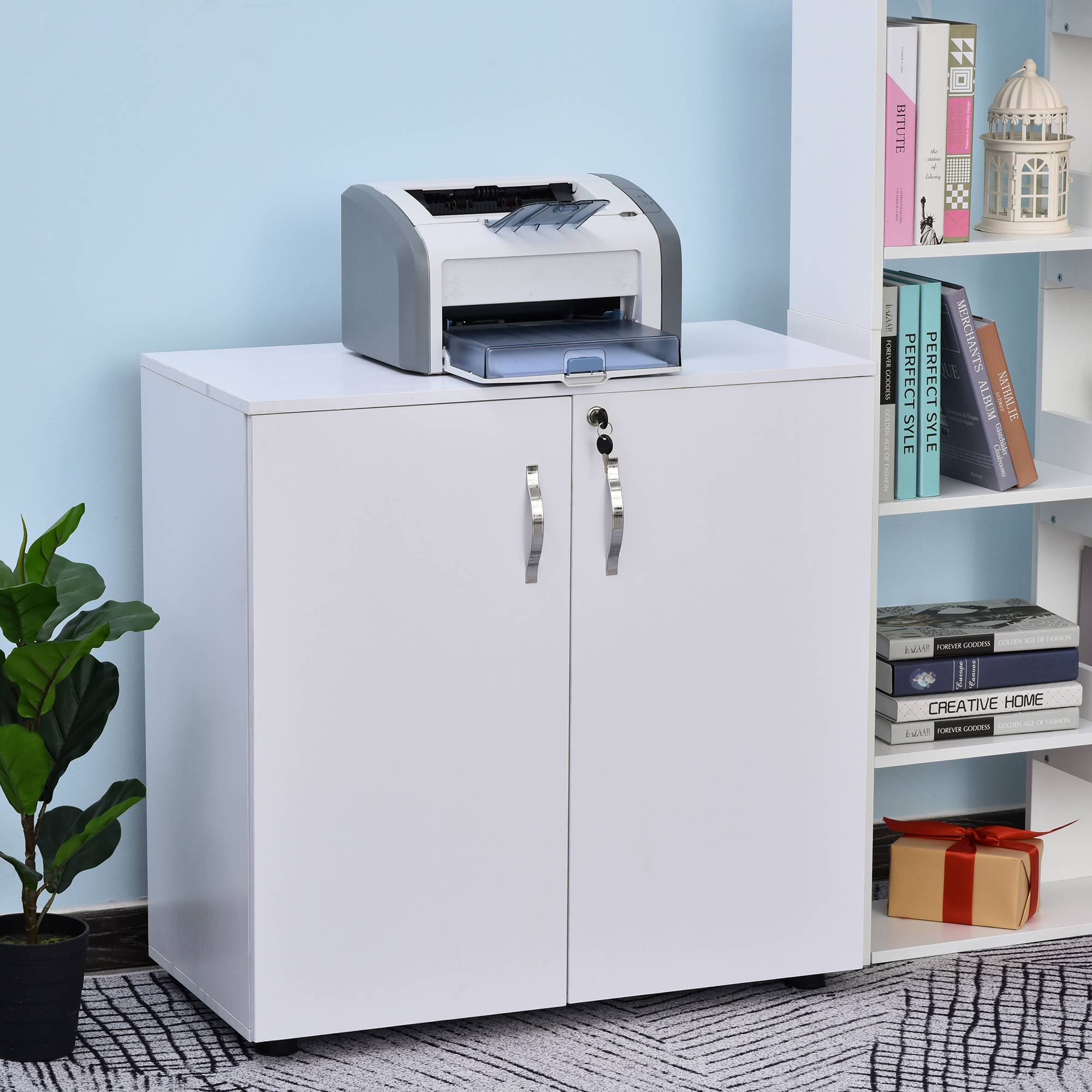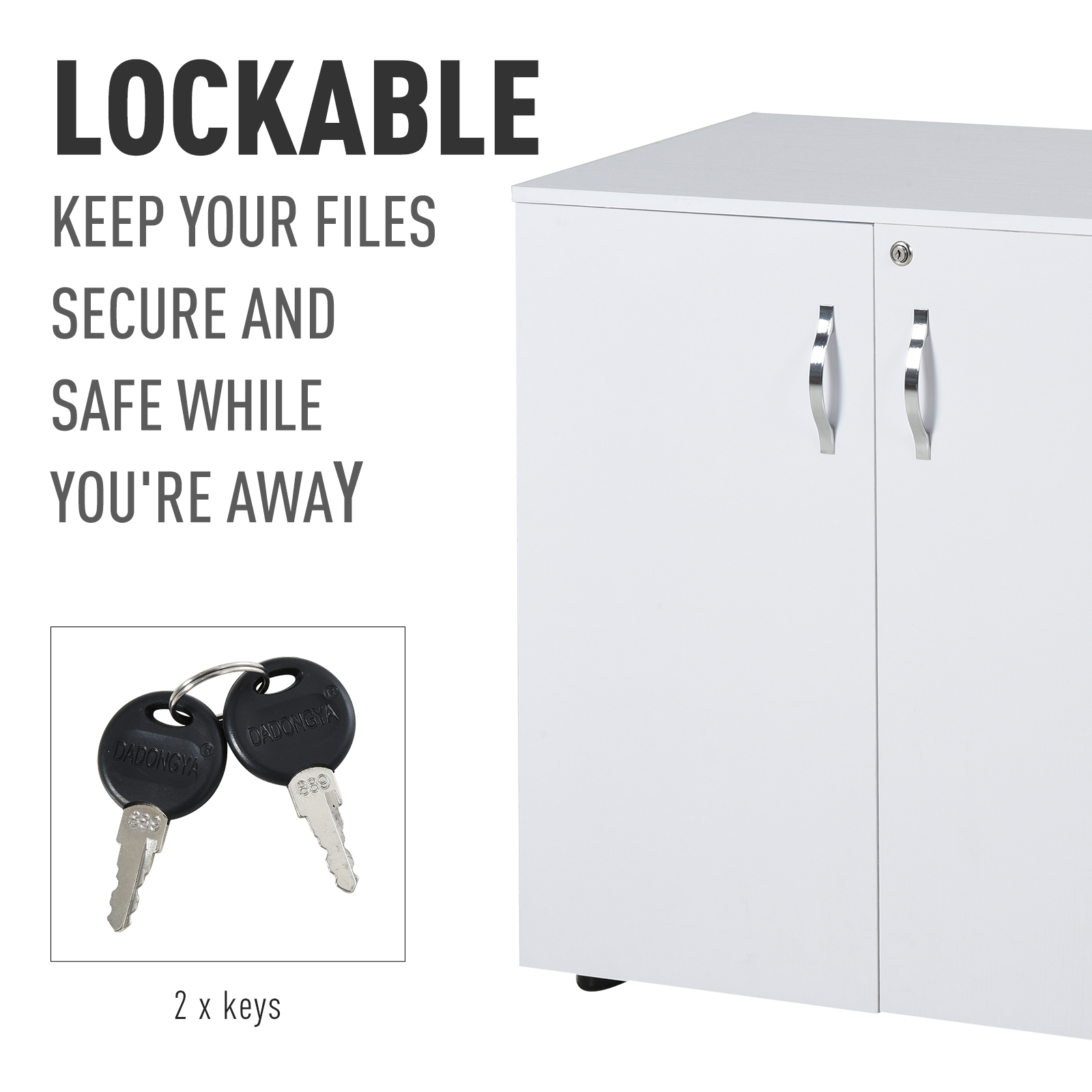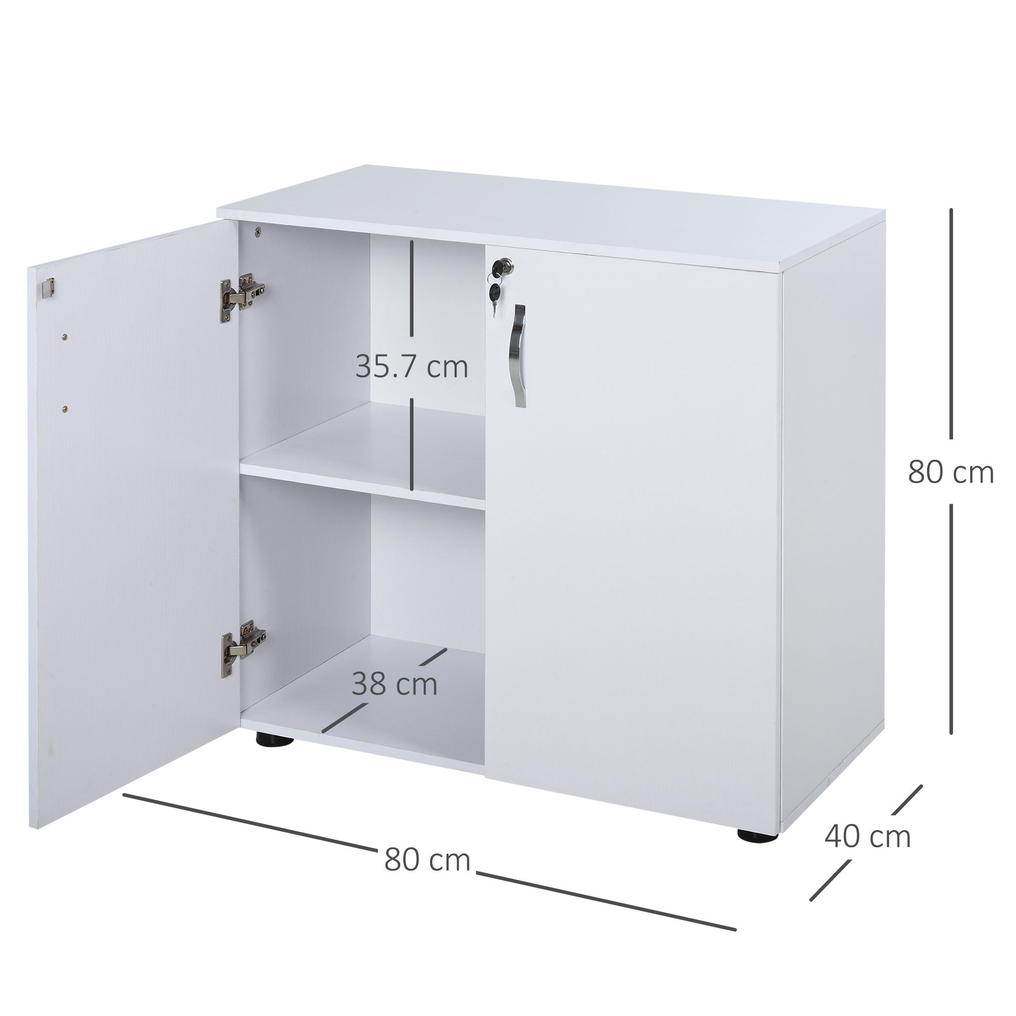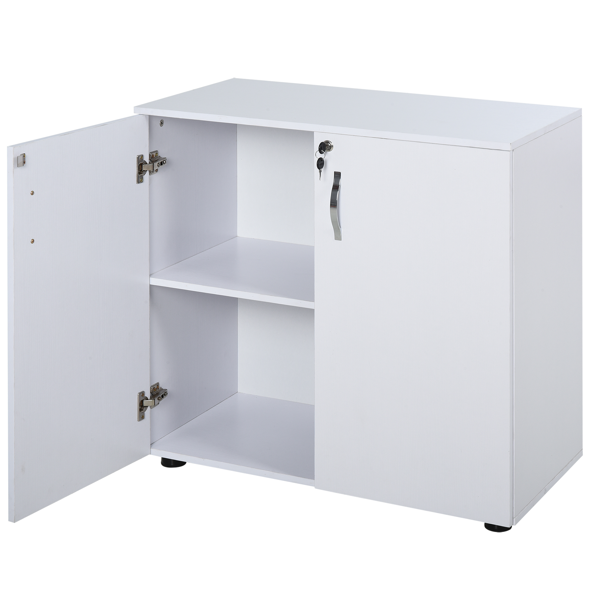 Keep the office organised and the area looking beautiful with this white storage cabinet from Vinsetto. With two hinged doors for easy access, inside a longline shelf sits to create two tiers for organisation of your files and papers. Made from particle board, this piece is tough and durable for everyday use. It's finished with feet to protect your floor and a lock for security. Comes with two keys.