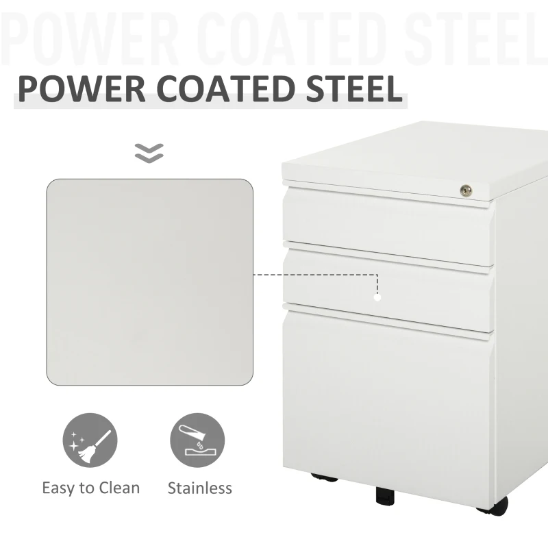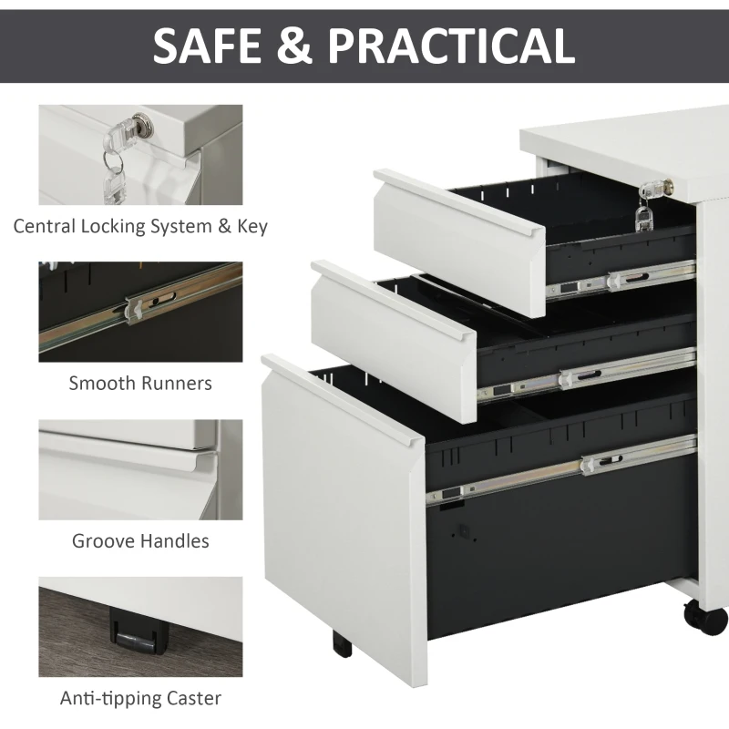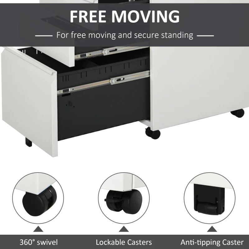 Vinsetto 3 Drawer Filling Cabinet, Mobile Metal File Cabinet with Anti-tilt Design for Letter, A4, Legal Size, White