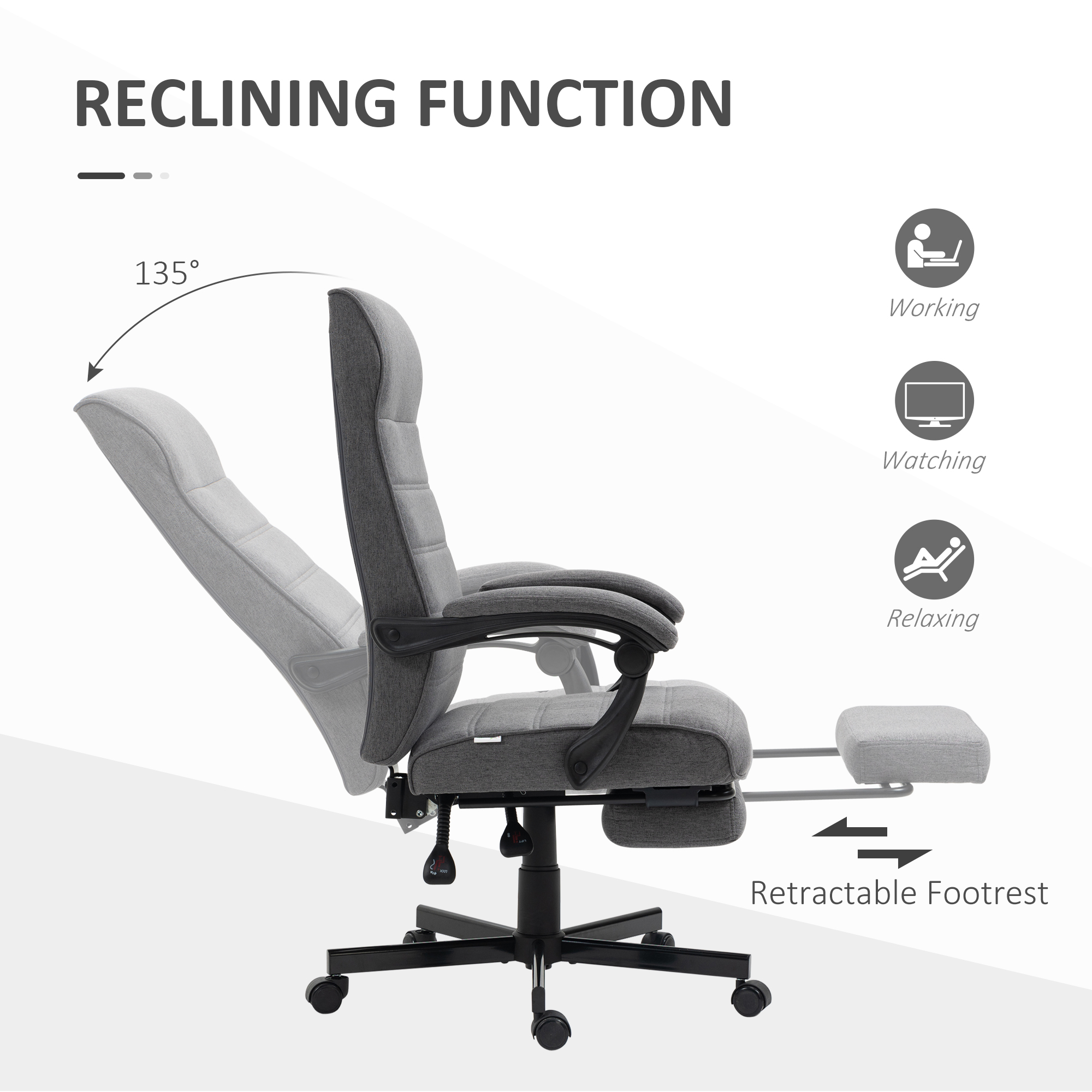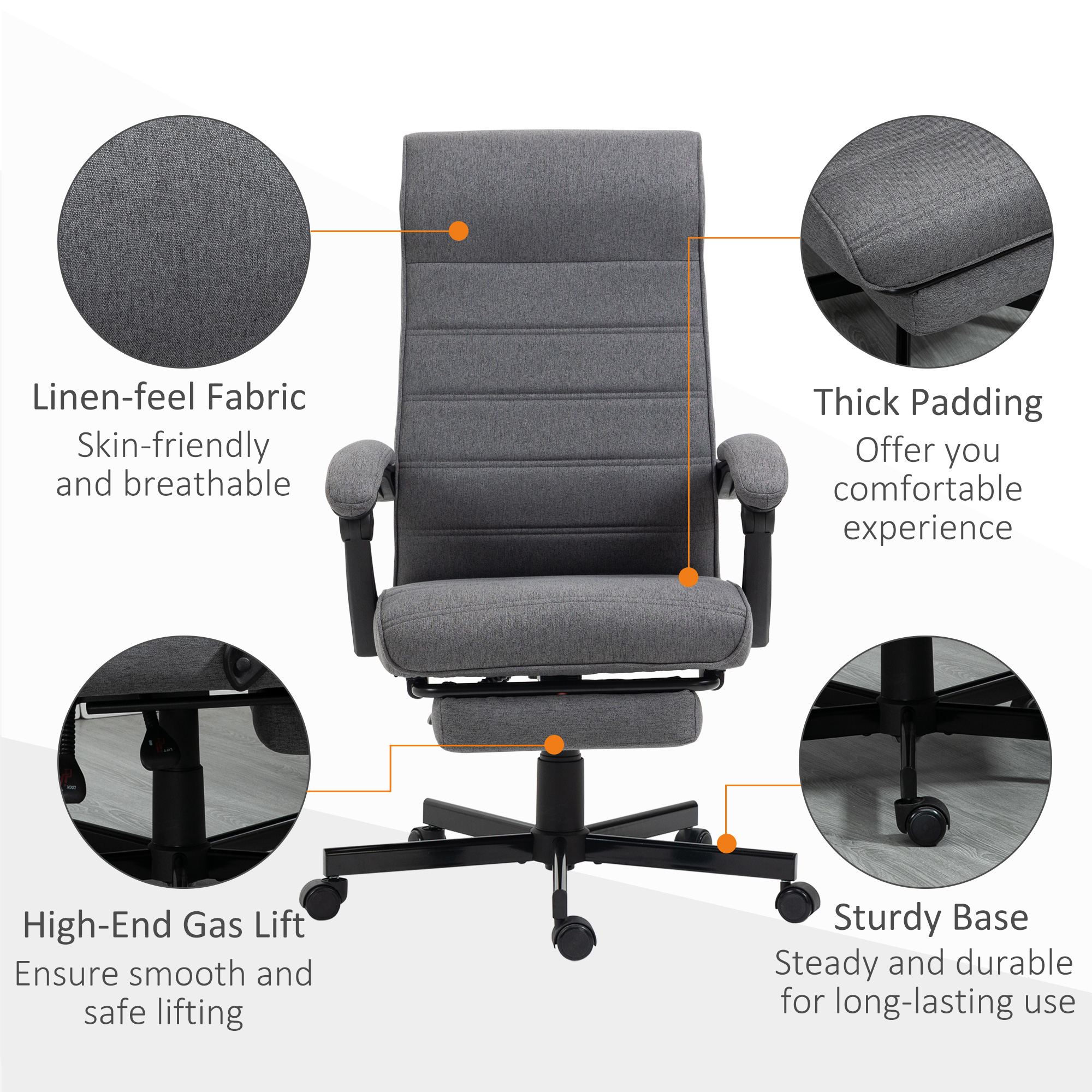 Details about Vinsetto High-Back Home Office Chair, Linen Swivel Reclining Chair with Adjustable Height, Footrest and Padded Armrest for Living Room, Study, Grey