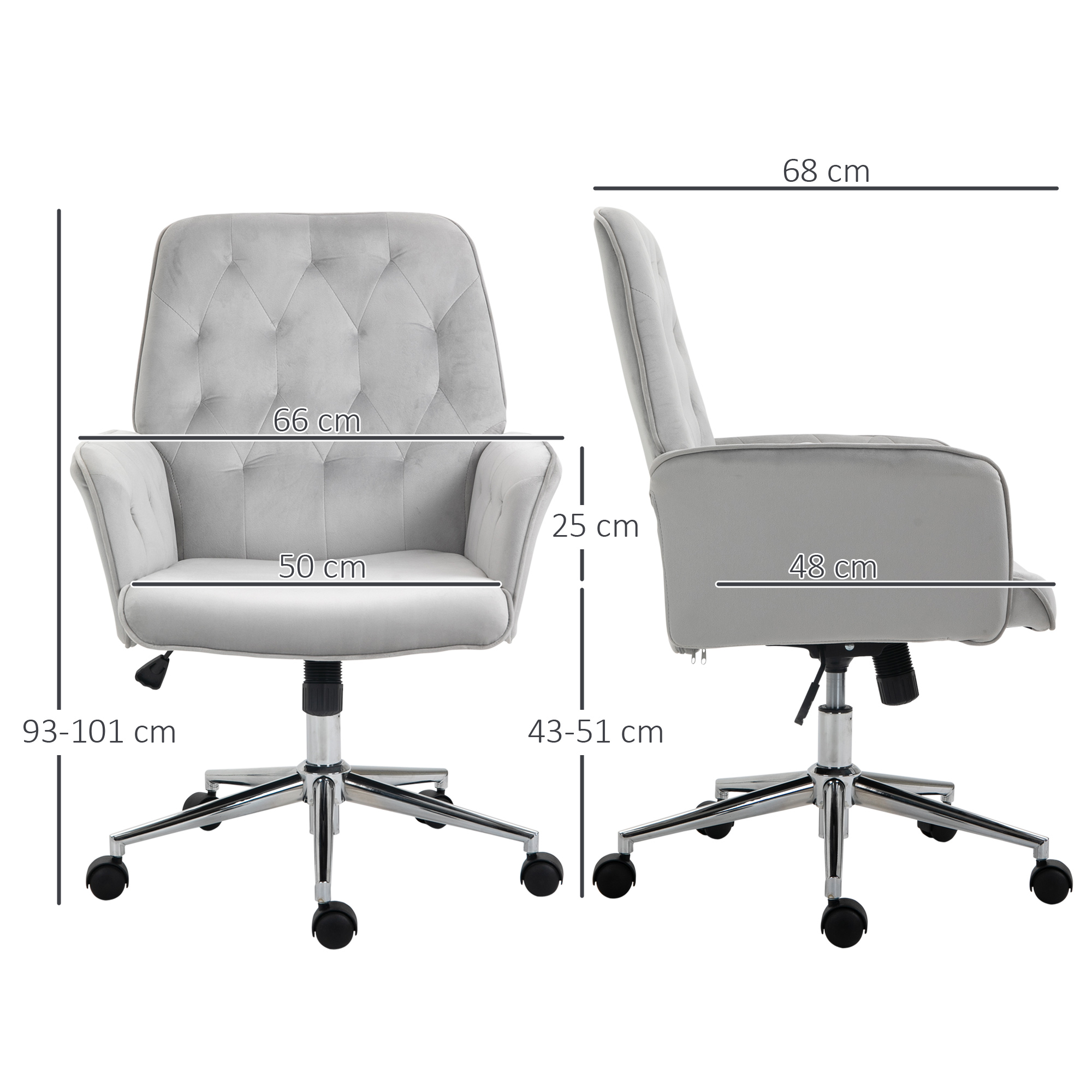 A luxe touch for work days, this Vinsetto is a piece you'll enjoy doing work in. Look to it's soft padding and velvet-feel upholstery for comfort. The 89.5-97cm adjustable height means you can set to a position of your choice. Five wheels on the base for easy movement. Complete with armrests and backrest for extra comfort and support.