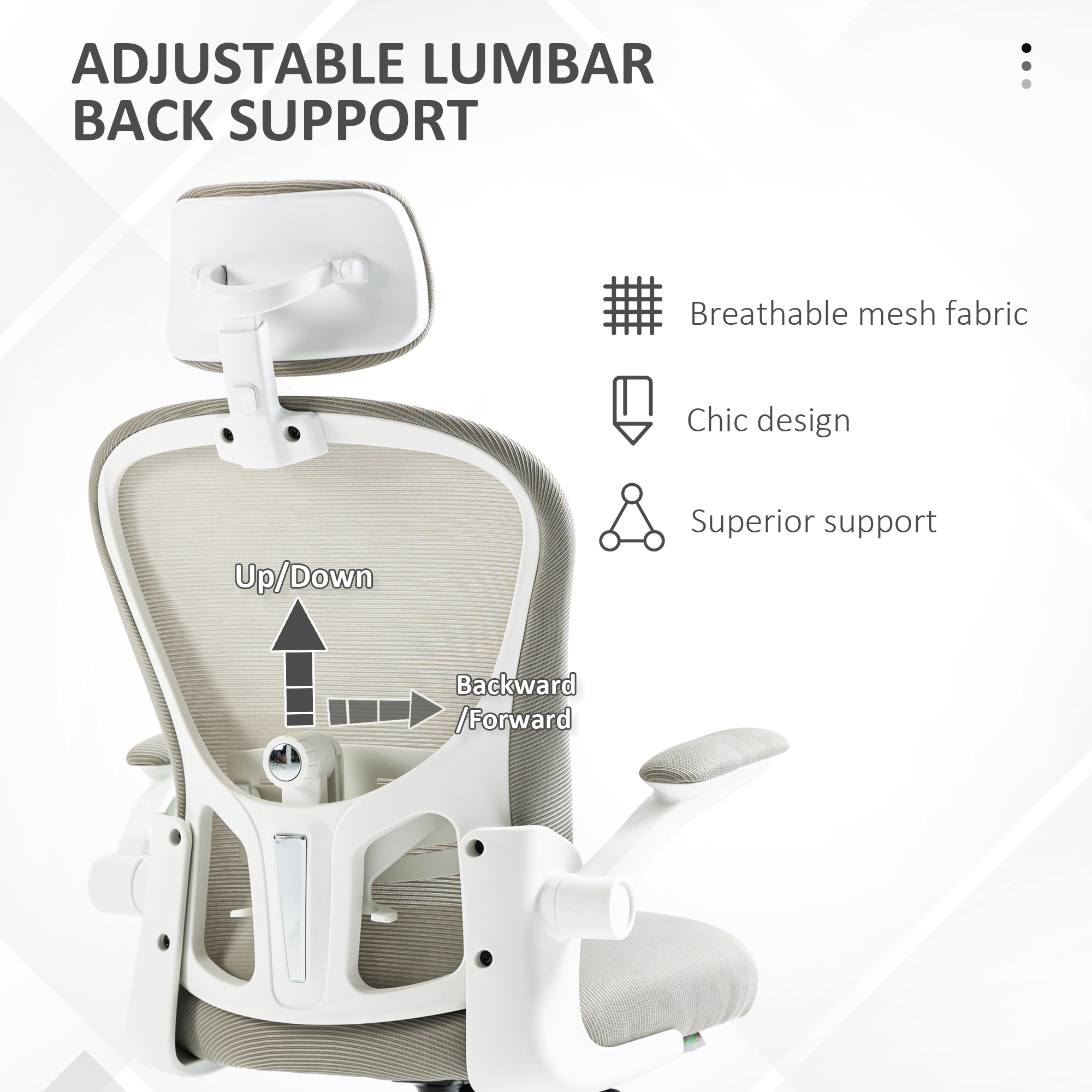 - Lumbar support moves up/down and forwards/backwards. Helps relieve low back pressure
