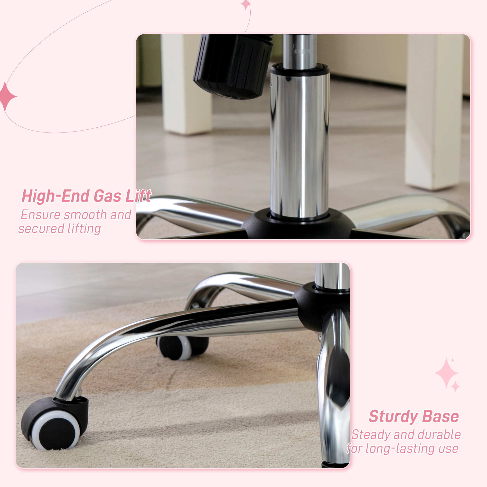 Inject a touch of glam and sophistication into your work day with this Vinsetto computer chair. Comfortable features include the thick padding, the adjustable tension back and armrests. Wrapped in velvet-feel upholstery, the back is scattered with an abundance of diamantes for top glamour. Completed with five wheels for easy movement. This comfortable office chair is a sparkling addition to your home office.