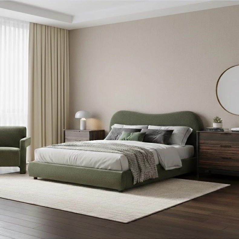 The Wave Bed in Natural Weave brings a warm, contemporary feel to any bedroom with its soft curves, cushioned headboard and inviting silhouette. Upholstered in a stylish olive soft weave fabric, the bed blends comfort with modern design, making it suitable for a wide range of interior styles—from minimalist to Scandinavian to cosy modern homes.