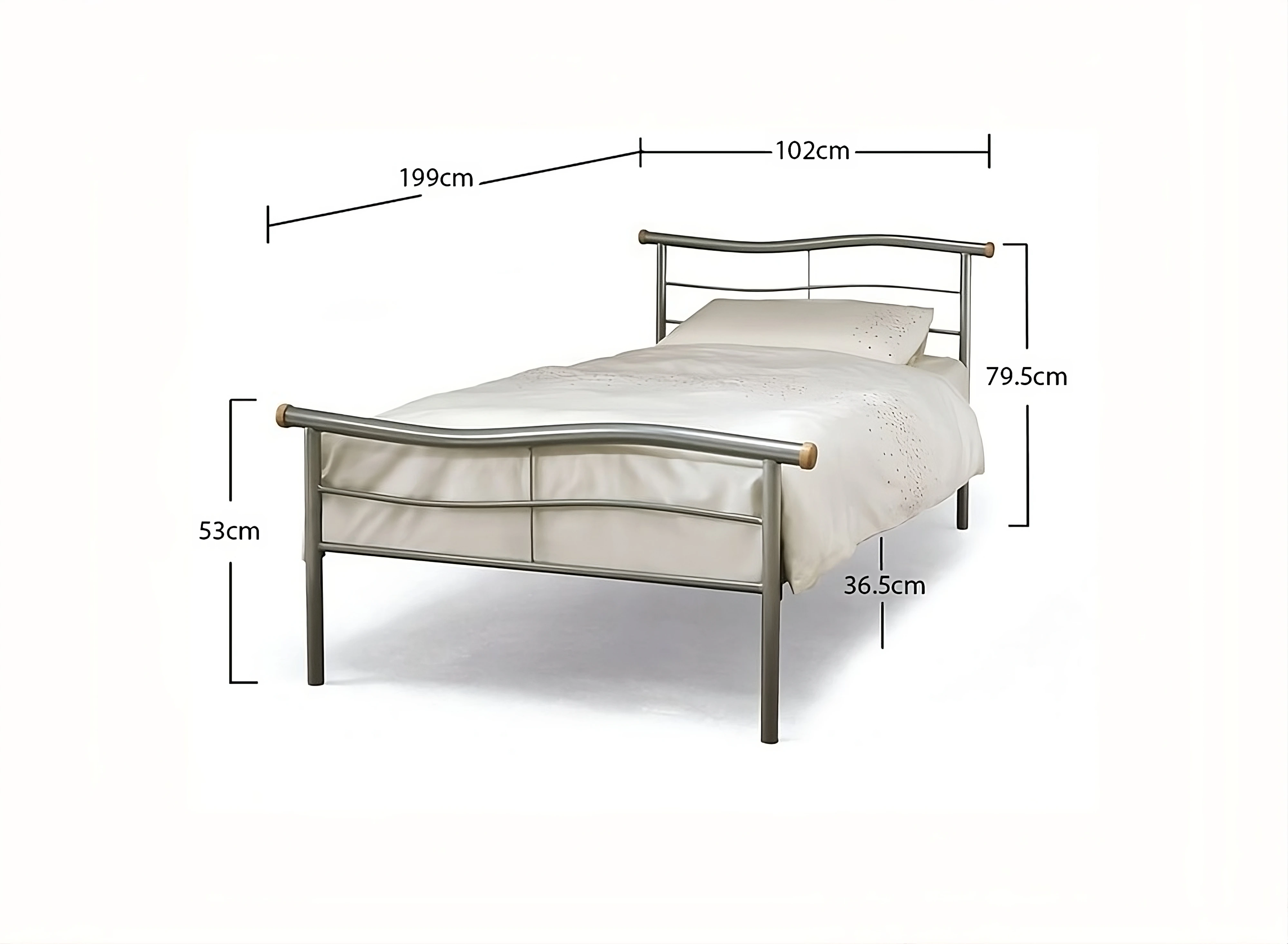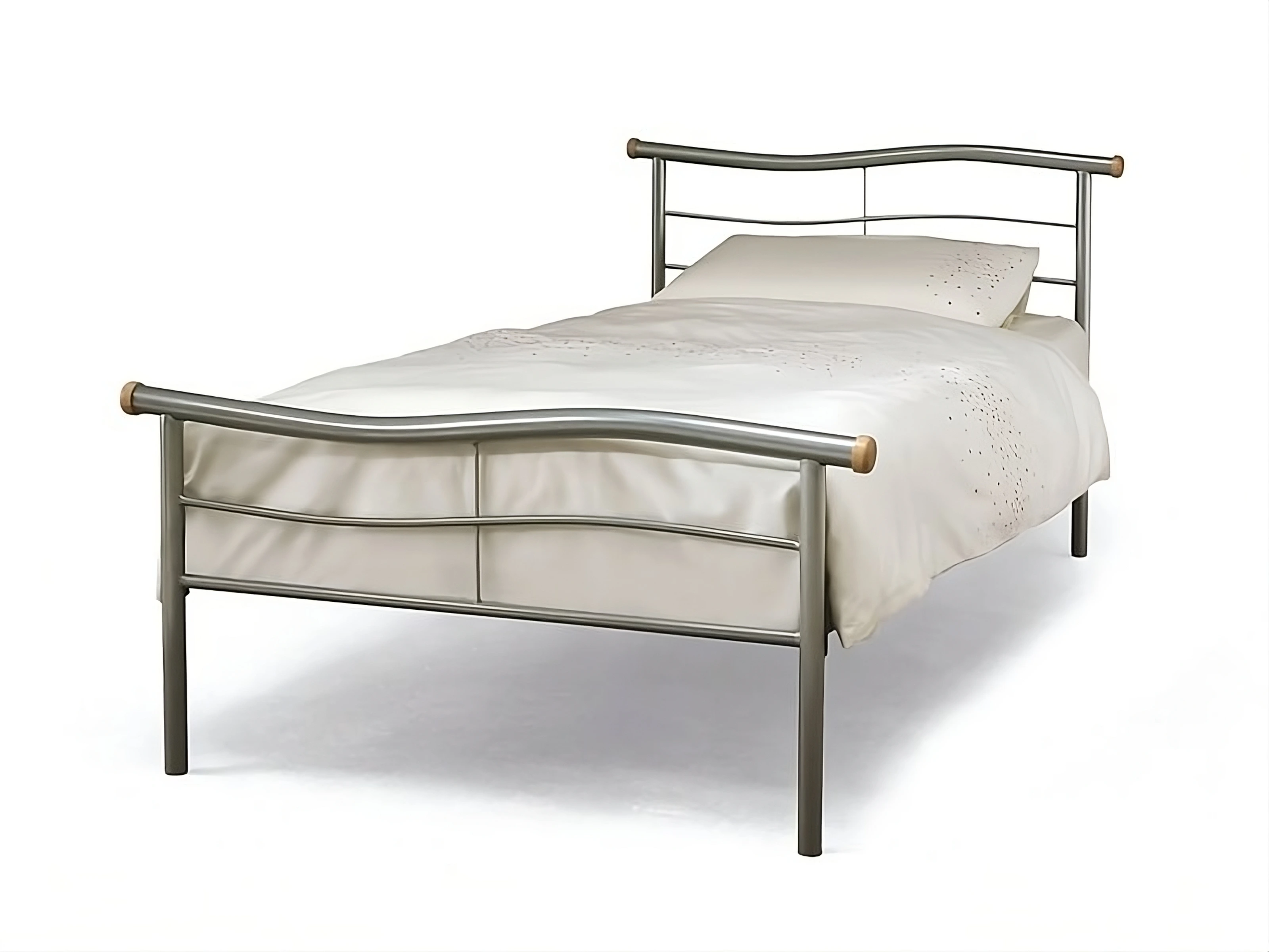 Metal bed frame which has a waved headboard and footboard with stylish wooden end caps. Sprung slatted base.