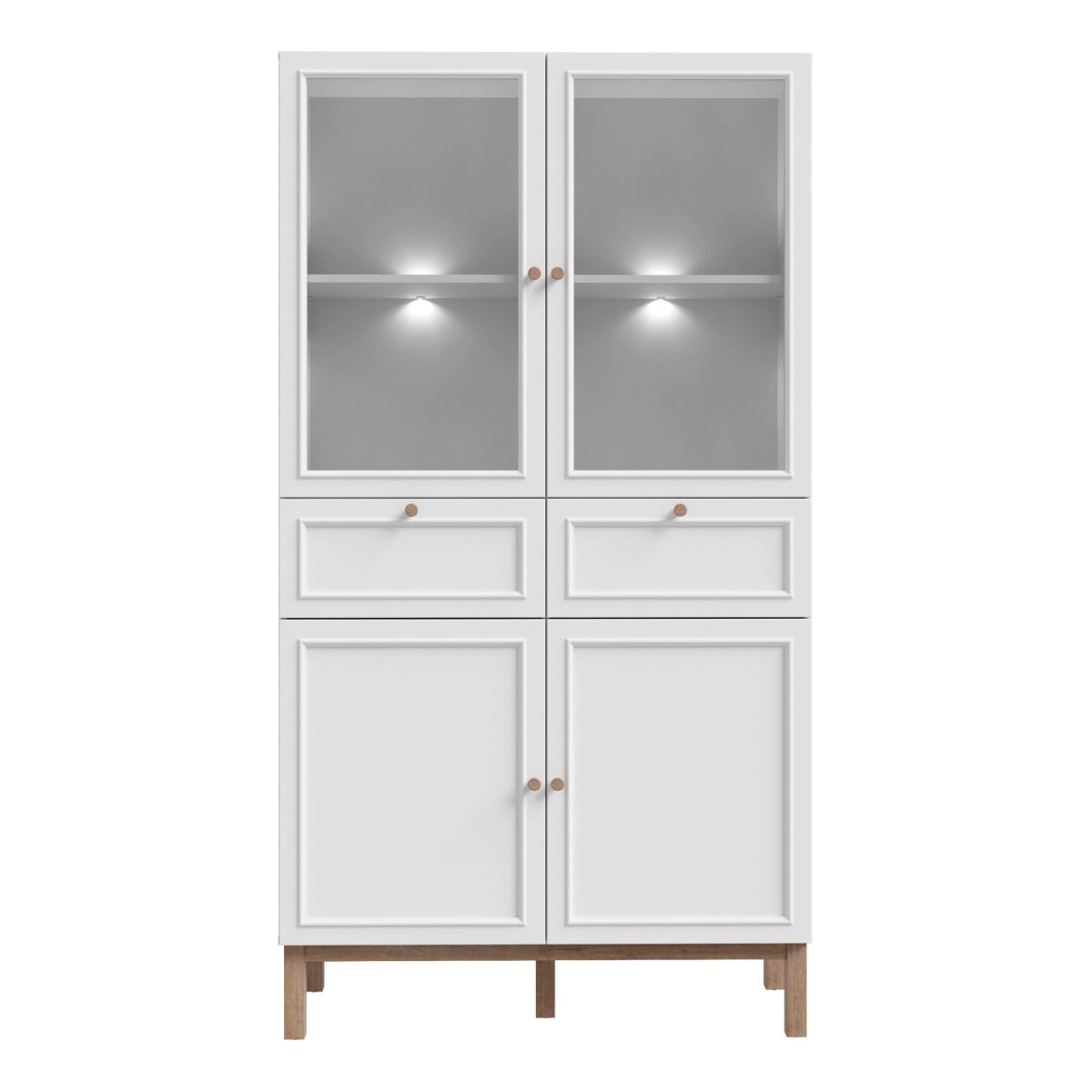 The Wensley Display Cabinet with 2 Doors, 2 Drawers, and 2 Glass Doors in Light Grey and Oak blends modern design with practical storage. Its sleek finish adds a contemporary touch, complementing a variety of interiors. Perfect for showcasing your prized items, the cabinet features two glass doors with toughened safety glass for durability. Integrated LED lighting softly highlights the interior, creating a warm, inviting glow for your decorations, glassware, or keepsakes.