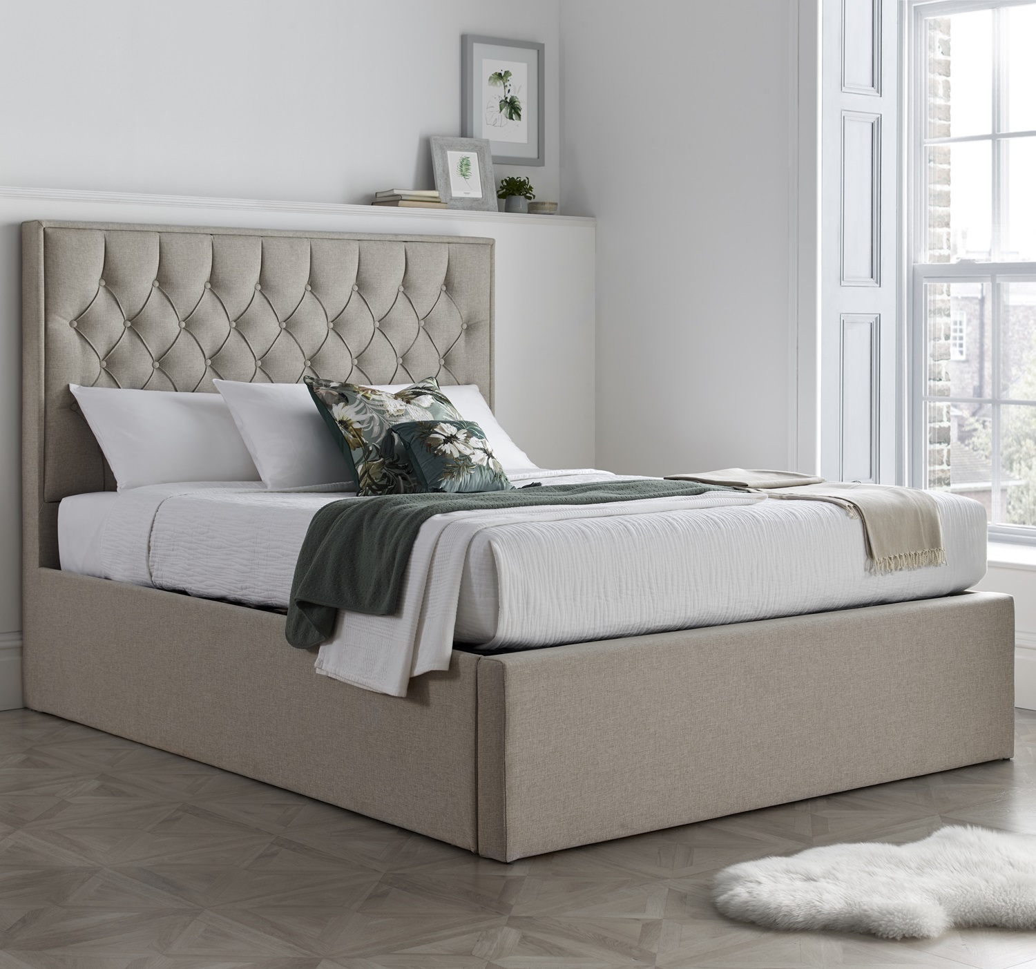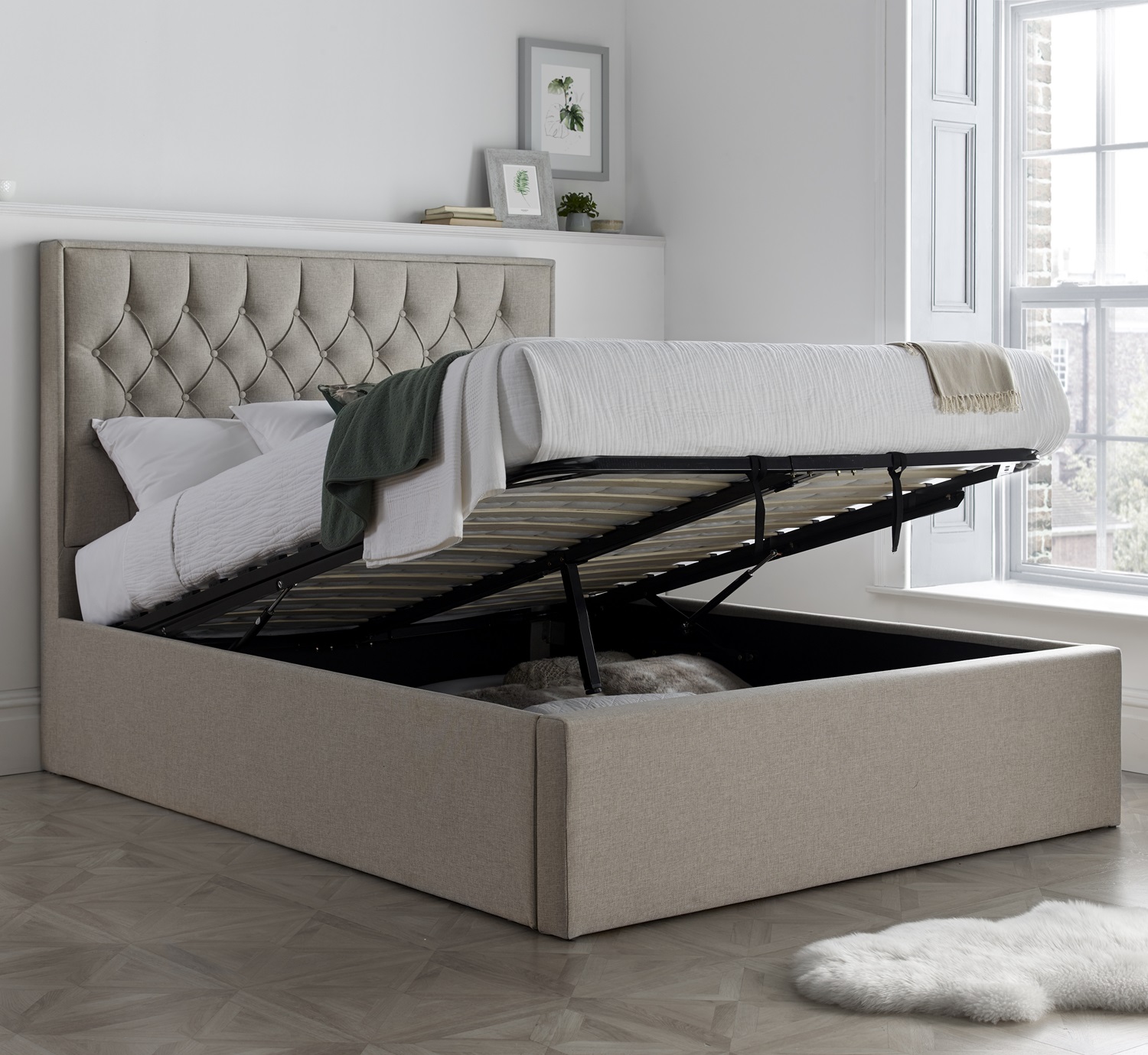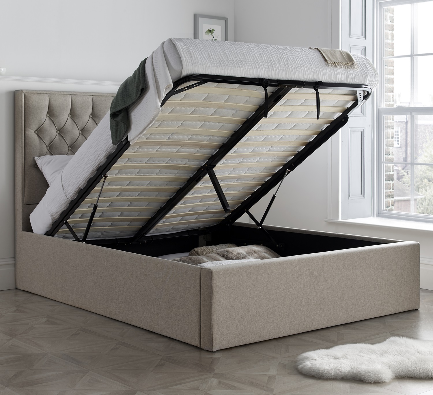 Wilson Oatmeal Fabric Ottoman Bed – Double | Gas Lift Storage Frame with Buttoned Headboard