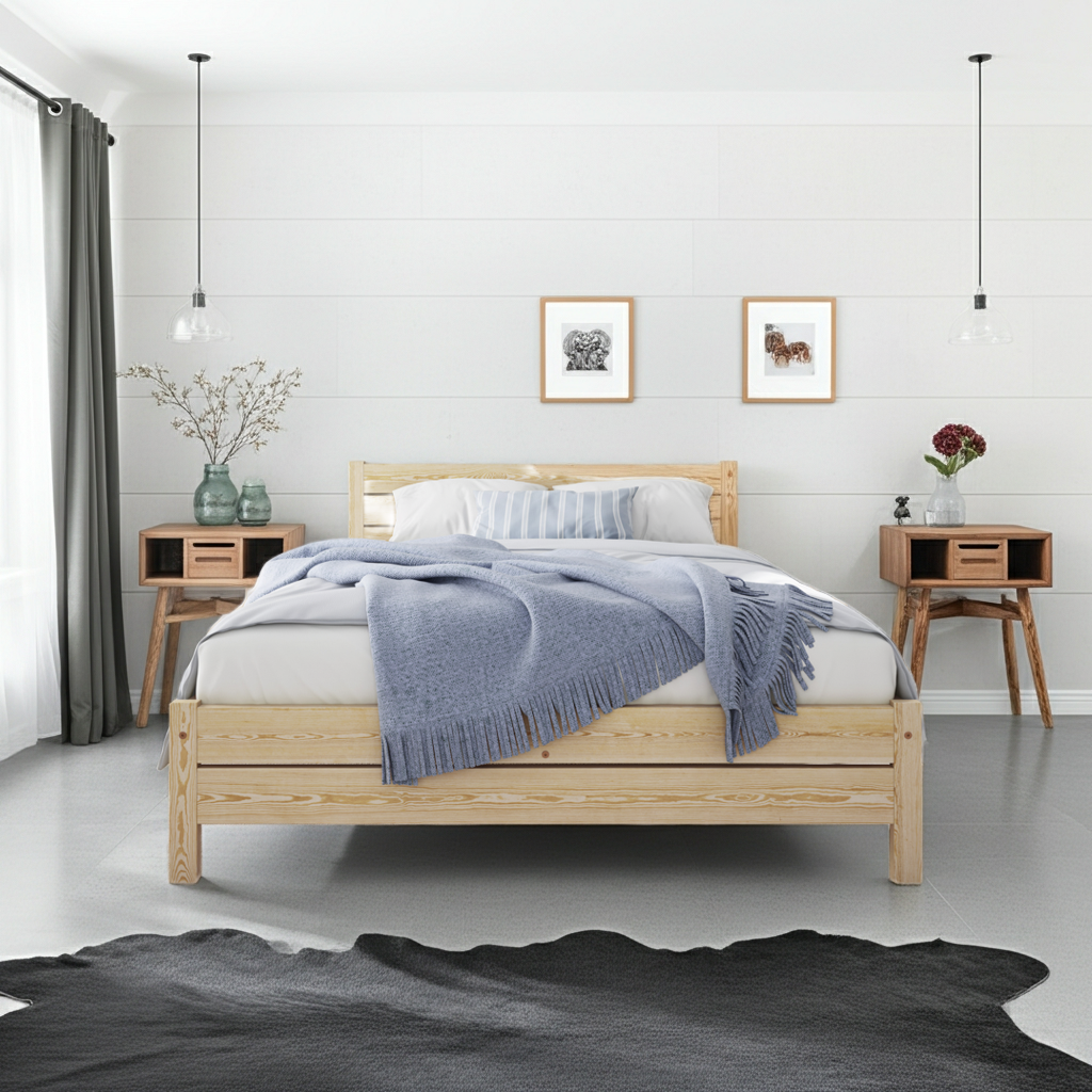 Elevate your bedroom with the Alva (F3) Wooden Bed Frame – a bold, rustic design handcrafted for comfort, strength, and timeless appeal. Made from 100% solid wood, this frame features a striking 90cm high headboard that offers excellent back support for reading or relaxing in bed.