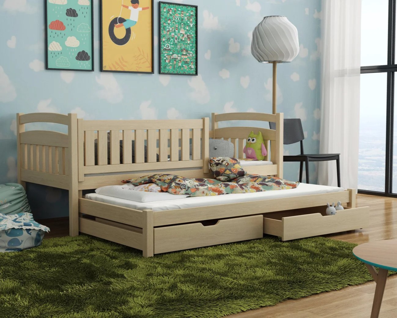 A beautifully crafted pinewood bed with a trundle and two storage drawers for extra storage. The primary bed is equipped with tall, universal safety guards and serves as a cot for infants and pre-schoolers. It's a great choice for small houses with bedrooms having limited space. A safe and chemical-free water-based paint is used to protect your child from any health-related harm.