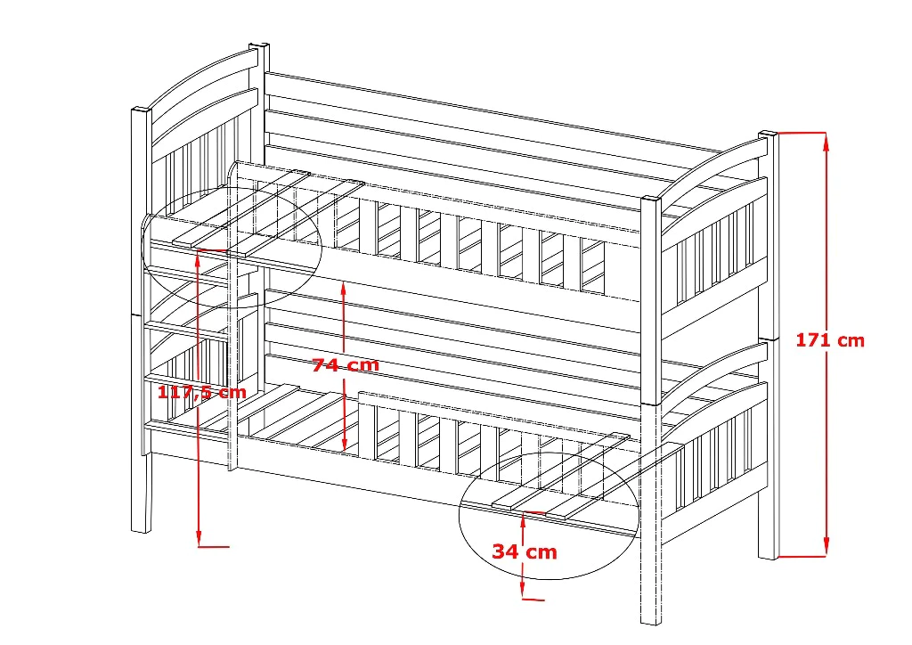 - The distance (bed clearance height) between the bottom and the top bed is 74cm.