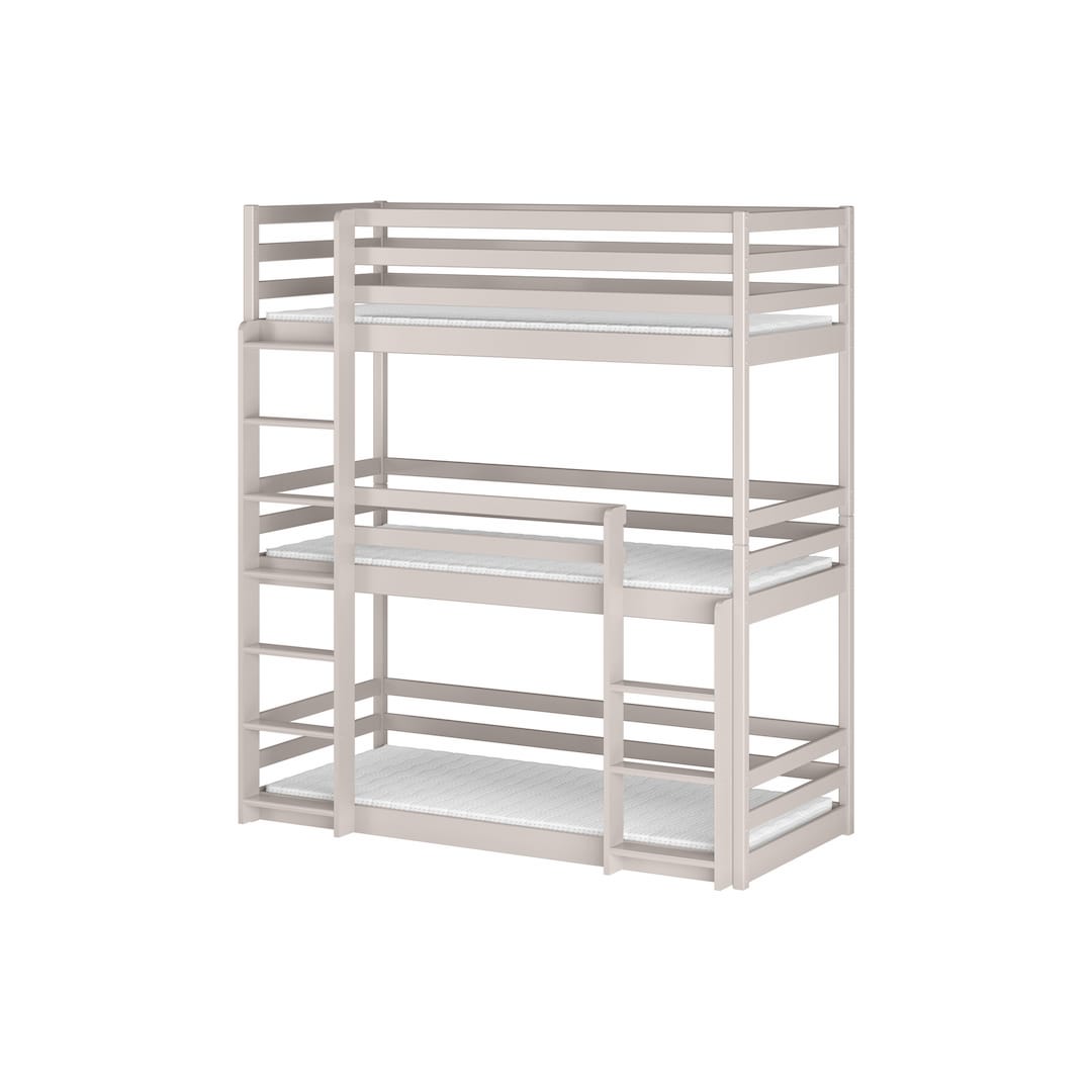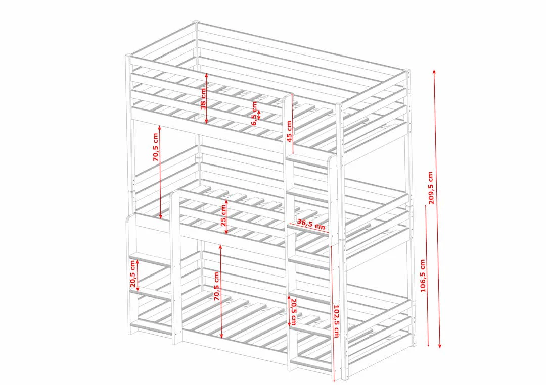 The Ted bunk bed is a triple-sleeper with two universal ladders and three floors with safety guard rails bordering each of them. It is finished in a refreshing white matt colour scheme that is effortless to blend in any interior style, regardless of the wall colour. Its mattresses can be purchased separately; two different types are available foam or coil spring.