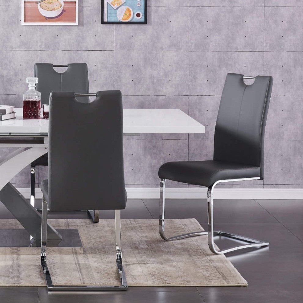 The Zurich PU Chairs Chrome & Grey (Set of 2) bring a touch of modern elegance to your dining area. Designed with PU leather seats in a sophisticated grey tone, these chairs offer both comfort and style. The chrome base adds a sleek, contemporary finish, making them a perfect match for various dining tables and interiors.